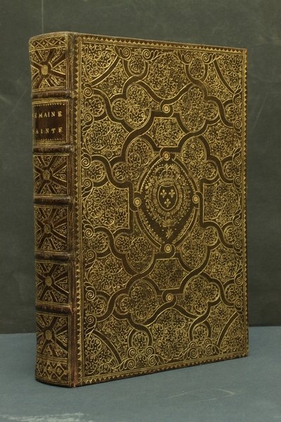 Parigi, Jacques Collombat, 1727. In-8ø grande; antiporta, titolo figurato inciso, 8 cc., 616 pp. con 5 finissime incisioni a piena pagina con vignette da disegni di Homblot. Centinaia di capilettera figurati. Ottimo esemplare. Bella legatura alle armi di Luigi XV di Francia con al centro dei piatti lo stemma e le sue iniziali, riconducibile all'atelier di Antoine-Michel Padeloup che realizz• numerose legature per il re. Inconsueta e spettacolare, presenta ai piatti una fittissima decorazione a piccoli ferri cesellati inscritti in spazi segnati da bande intrecciate. Merletto interno, tagli dorati. Sguardie in carta con decorazioni floreali policrome in rilievo su fondo oro. Questa tipologia di esecuzione rimanda allo stile "fanfare" del tipo tardo.