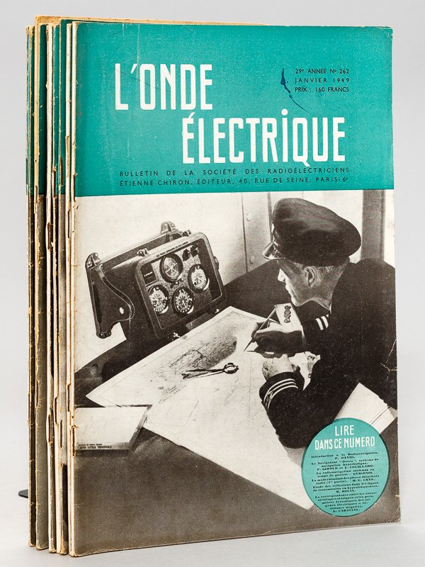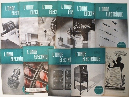 12 numéros en 11 vol. in-4 br., couv. ill., ill. noir et blanc, L'Onde électrique - Bulletin de la Société des Radioélectriciens, étienne Chiron éditeur, Paris, 463 pp. Au sommaire : n° 262 Introduction à la Radionavigation ; Le Navigateur "Decca", système en navigation hyperbolique ; La navigation aérienne en temps de guerre ; La modernisation des pièces détachées radio ; Etude des réflexions dans les lignes de transmission en hyperfréquence ; La correspondance entre les caractéristiques statiques et les paramètres dynamiques des organes électriques à résistance négative ; n° 263 : Philippe Le Calvez ; Les radiophares du type "Consol" ; Théorie des tubes à ondes progressives ; Mesure des impédances d'antennes à bord d'avion ; n° 264 : Louis Lumière ; Aides radioélectriques à l'approche et à l'atterrissage. Contrôle du trafic aérien ; Les antennes en hyperfréquences ; Amplificateurs à circuits antirésonnants à accords décalés ; Le glissement de fréquence par lampes à réactance variable ; L'inventeur de la T.S.F. ; n° 265 : Série de tubes modernes pour la Radiodiffusion en modulation de fréquence et pour la télévision ; L'absorption ionosphérique et le calcul des champs à distance ; Conditions de sensibilité maxima des radiomètres U.H.F. ; le XIIIe Salon International de présentation technique des pièces détachées ; n° 266 : Contribution à la discussion des standards de télévision ; Les raisons du choix du 819 lignes ; Bases théoriques des choix de normes de télévision ; Radars de navigation maritime ; Le Groupement des Acousticiens de langue française et les "Cahiers d'Acoustique" ; n° 267 : Bruit de fond des diodes à cristal ; Les compteurs électriques d'impulsions ; Le câble d'atterrissage et ses applications modernes posibles ; Bernard Audebert de la Pinsonnie ; n° 268 : Problèmes posés par la fabrication des tubes fonctionnant aux très hautes fréquences ; Méthodes permettant de mettre en évidance les caractéristiques et limitations des tubes électroniques en V.H.F. et U.H.F. ; Le "Loran" ; Au XVIIIe Salon International de l'Aviation ; n° 269-270 : Etude et réalisation d'une télécommande électronique d'artillerie ; n° 271 : René MESNY ; Le sytème "OBOE" ; Propriétés bilogiques des micro-ondes ; Le dipôle magnétique dans une atmosphère stratifiée ; n° 272 : La transmission triode type PTT 601 ; Etude géométrique du nombre de canaux à adopter en télévision ; Le rayonnement radioélectrique du Soleil et de la Voie Lactée ; L'amplification sélective en basse fréquence ; n) 273 : Etude théorique et expérimentale de la détection par les cristaux au Silicium ; L'amplification sélective en basse fréquence ; Exposition pour l'équipement de l'Union Française ; Table des matières du volule XXIX. Etat satisfaisant (couv. frottées avec accrocs, manque couv. du n° 269-270, intérieurs en bon état par ailleurs). Prix pour l'ensemble. Ensemble peu courant. Poids de 1,7 Kg
