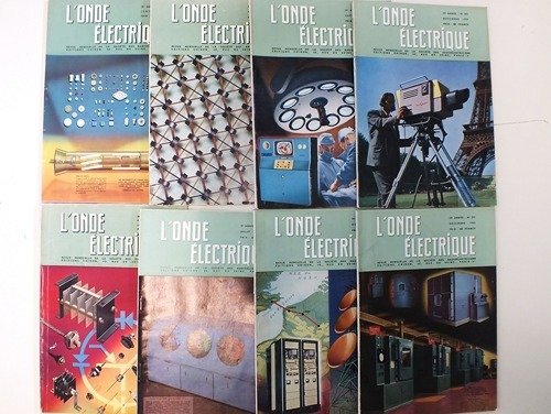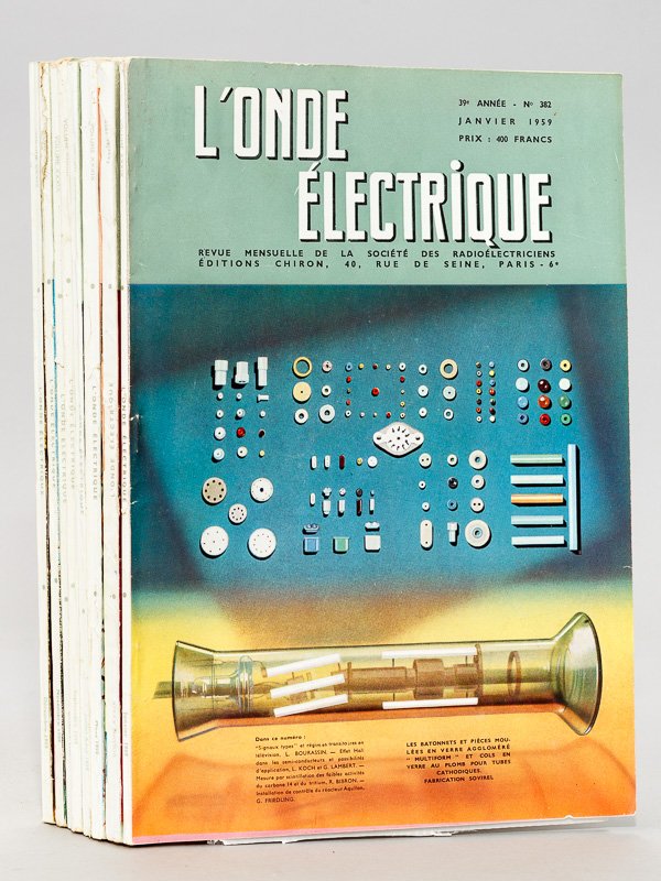 9 numéros en 8 vol. in-4 br., couv. ill., ill. noir et blanc, L'Onde électrique - Revue Mensuelle de la Société des Radioélectriciens, étienne Chiron éditeur, Paris, 1959, env. 750 pp. Au sommaire : n° 382 Signaux types et régimes transitoires en télévision ; L'effet Hall dans les semi-conduteurs et ses possibilités d'application ; Mesure par scintillation des faibles activités du carbone 14 et du tritium ; L'installation de contrôle du réacteur Aquilon ; n° 383 : Numéro Pièces détachées professionnelles en électronique ; n° 384 Congrès International Circuits et Antennes Hyperfréquences ; n° 388-389 L'émission radioélectrique des satellites artificiels ; L'écoute des satellites artificiels au centre de la RTF de Limours ; Un équipement de télémesure pour fusée ou ballon-sonde ; Equipement de télévision médicale en couleurs ; Progrès dans le domaine du reportage télévisé ; Matériel professionnel de télévision en couleurs utilisant l'analyse trichrome simultanée ; Note sur la réduction de la quantité d'information contenue dans une image de télévision ; Le brouillage des images de télévision par les signaux parasites ; n° 390 Développement des matériels de transmission à bande latérale unique ; Les magnétrons industriels ; Amplificateurs à large bande à transistors ; Traversées hermétiques isolantes en verre-fritté ; La télévision sous-marine ; n° 391 : Equipements de faisceaux hertziens dans la bande 3800 - 4200 MHz ; Les antennes dans l'espace ; Carcinotrons de type O ; Convertisseur continu-continu régulé à transistors ; Quelques aspects actuels de la recherche opérationnelle ; Influence du courant de grille sur les oscillations d'une triode ; Etude théorique et fonctionnement physique d'un intégrateur logarithmique ; De la télévision en noir et blanc à la télvision en couleur ; n° 392 : Le rayonnement infrarouge et ses applications pratiques ; Systèmes filtrants à couches multiples utilisés en infrarouge ; Le silicium dans les optiques infrarouge ; Application des procédés de photogravure au dépôt de contacts métalliques sur les semi-conducteurs ; etc. : n° 393 : La méthode des nombres combinatifs dans l'étude du champ électromagnétique ; Quelques aspects théoriques et pratiques des jeux de stratégie ; Mesures sur l'effet Doppler-Fizeau des satellites artificiels ; Table des matières Etat satisfaisant (couv. frottées avec qques accrocs, intérieurs en bon état). Prix pour l'ensemble. Ensemble peu courant. Poids de 2,9 Kg