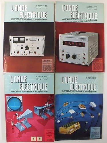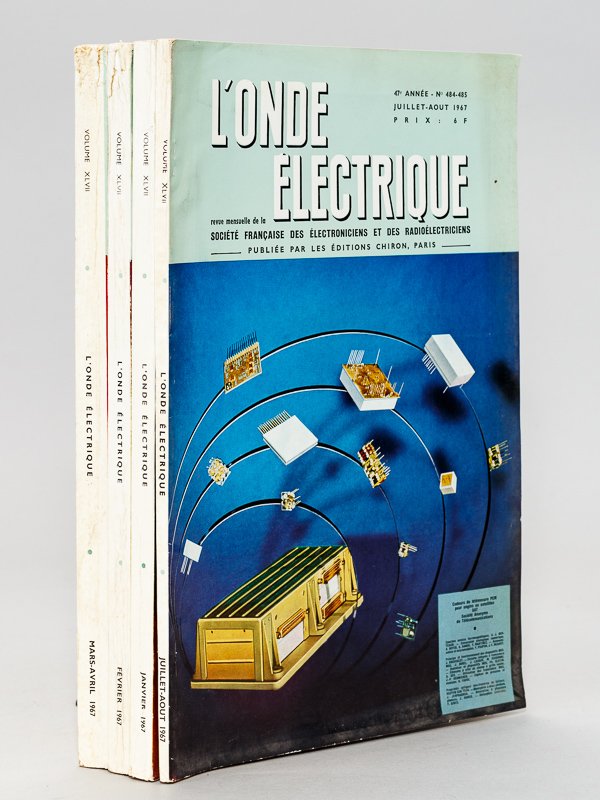 6 numéros en 4 vol. in-4 br., couv. ill., ill. noir et blanc, L'Onde électrique - Revue Mensuelle de la Société française des électroniciens et des radioélectriciens, éditions Chiron, Paris, 1967, env. 620 pp. Au sommaire : n° 478 : Colloque international "récepteurs micro-ondes à faible bruit" 1ère partie (dossier de 125 pp.) ; n° 479 id., (dossier de 145 pp.) ; n° 480-481 Numéro Spécial consacré aux composants électroniques ; n° 484-485 : Automatisation de la fabrication et du test de circuits micromodules à l'usine IBM France de Corbeil Esonnes ; Dispositifs métal-oxyde-semiconducteurs et applications (dossier de 30 pp.) ; Optique non-linéaire ; Salon international de l'électroacoustique 1967. Etat très satisfaisant (couv. lég. frottées avec qques accrocs sur dos, intérieurs en bon état). Prix pour l'ensemble. Ensemble peu courant. Poids de 2,2 Kg