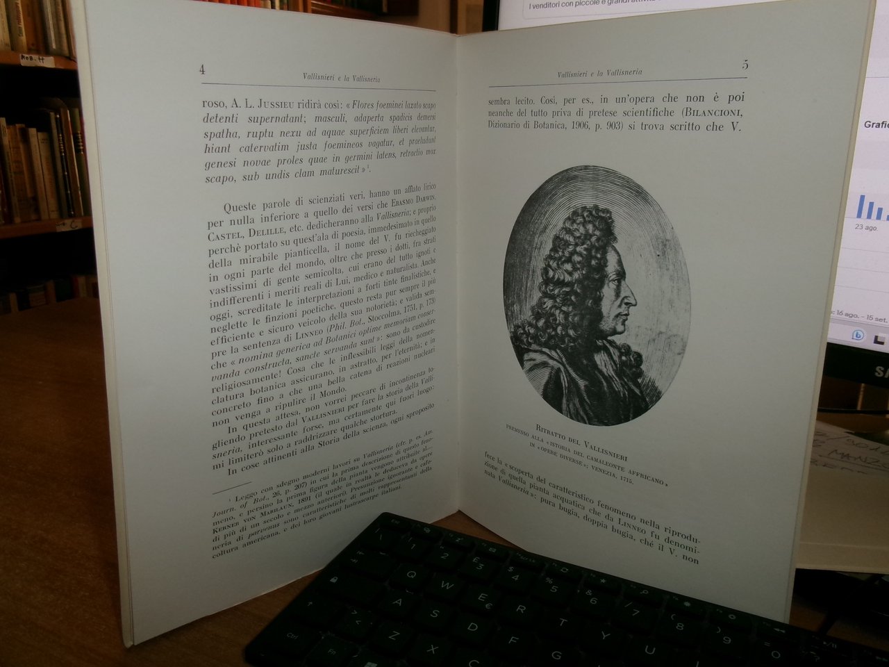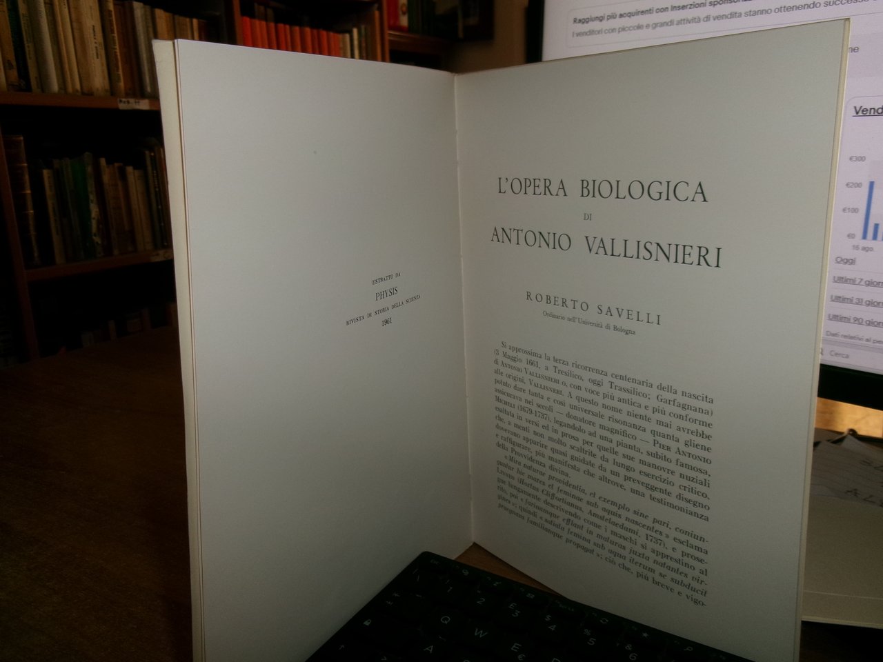ROBERTO SAVELLI. Bologna, Luigi Parma, 1961. L' OPERA BIOLOGICA di ANTONIO VALLISNIERI. (estratto da Physis Rivista di Storia della Scienza, 1961). In-8° grande, br. 53 pp. con ritratti e alcune figure n.t. Ottimo stato. Neg. mob. nero 10 entro busta trasp.
