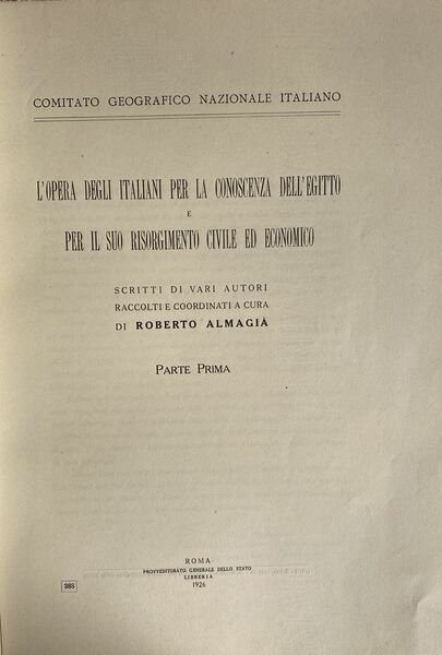 L'opera degli italiani per la conoscenza dell'Egitto e per il suo risorgimento civile ed economico. Parte prima. Scritti di vari autori raccolti e coordinati da R. Almagià