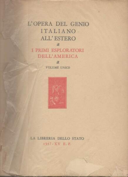 In 4, br., sovracc., velina, pp. 515, LXVII tavv. alcune ripiegate, cartella allegata in fine con 12 tavv. ripiegate. Copia numerata 219/500. Importanti lacerazioni  e mancanze alla velina, piccoli strappi alla testa del dorso, interni e allegati in piu' che buono stato, ordinari segni del tempo. Luogo di pubblicazione RomaEditore La Libreria dello Stato Anno pubblicazione 1937Materia/Argomento Storia, Esplorazioni ***Due to bureaucratic reasons, books dated over 70 years old cannot be immediately exported, please contact us before placing the order.***