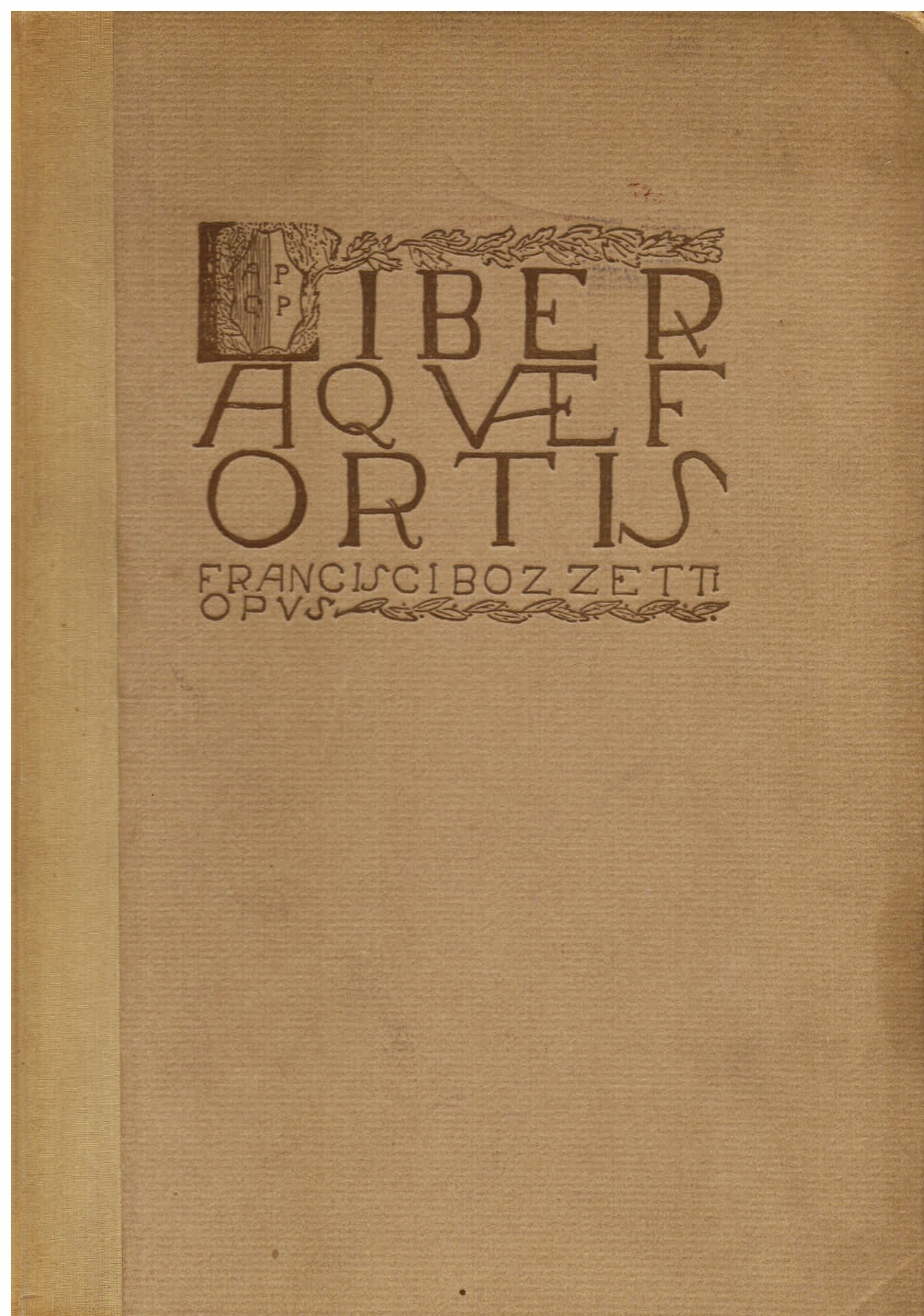 In-8° (250x175mm), pp. (16), 101, (2), mezza tela editoriale beige con titoli al dorso e cartiglio Liber Aquaefortis Francisci Bozzetti Opus entro racemi impresso a secco al piatto anteriore. 35 tavv. f.t. (una all'antiporta) con riproduzioni di acqueforti di Bozzetti e varie figure. intercalate nel testo. In fine, su 22 tavole in carta patinata, riproduzione dell'intera opera grafica dell'artista. Ottimo esemplare orfano della sovracoperta Edizione originale (copia n° 187/1500 firmate dall autore). Fondamentale catalogo ragionato dell'attività incisoria del Bozzetti (Lecce, 1876-Borgoratto, 1949), fra i maggiori acquafortisti italiani del '900.