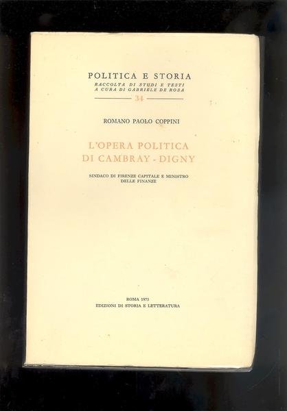 IN 8°,pp.442+UNA RACCOLTA BIBLIOGRAFICA DI STUDI SU POLITICA E STORIA A CURA DI GABRIELE DE ROSA.OPERA FACENTE PARTE DELLA COLLANA:POLITICA E STORIA n°34.<BR>INTERESSANTE LAVORO SU CAMBRAY-DIGNY,SINDACO DI FIRENZE CAPITALE E MINISTRO<BR>DELLE FINANZE. COPERTINA IN CARTONCINO SEMIRIGIDO CON TITOLI. OTTIMA CONSERVAZIONE.ID 616