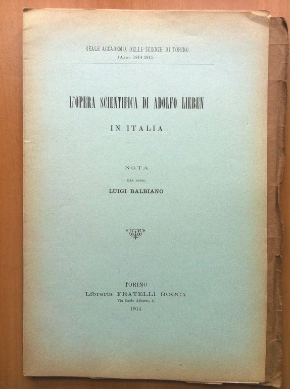 L'OPERA SCIENTIFICA DI ADOLFO LIEBENIN ITALIAReale Accademia delle Scienze di Torino Anno 1914-1915Nota del socio Luigi BalbianoTorino 191411 pagine intonse - formato 16,5x25 cm in ottimo stato (25 g)E14588