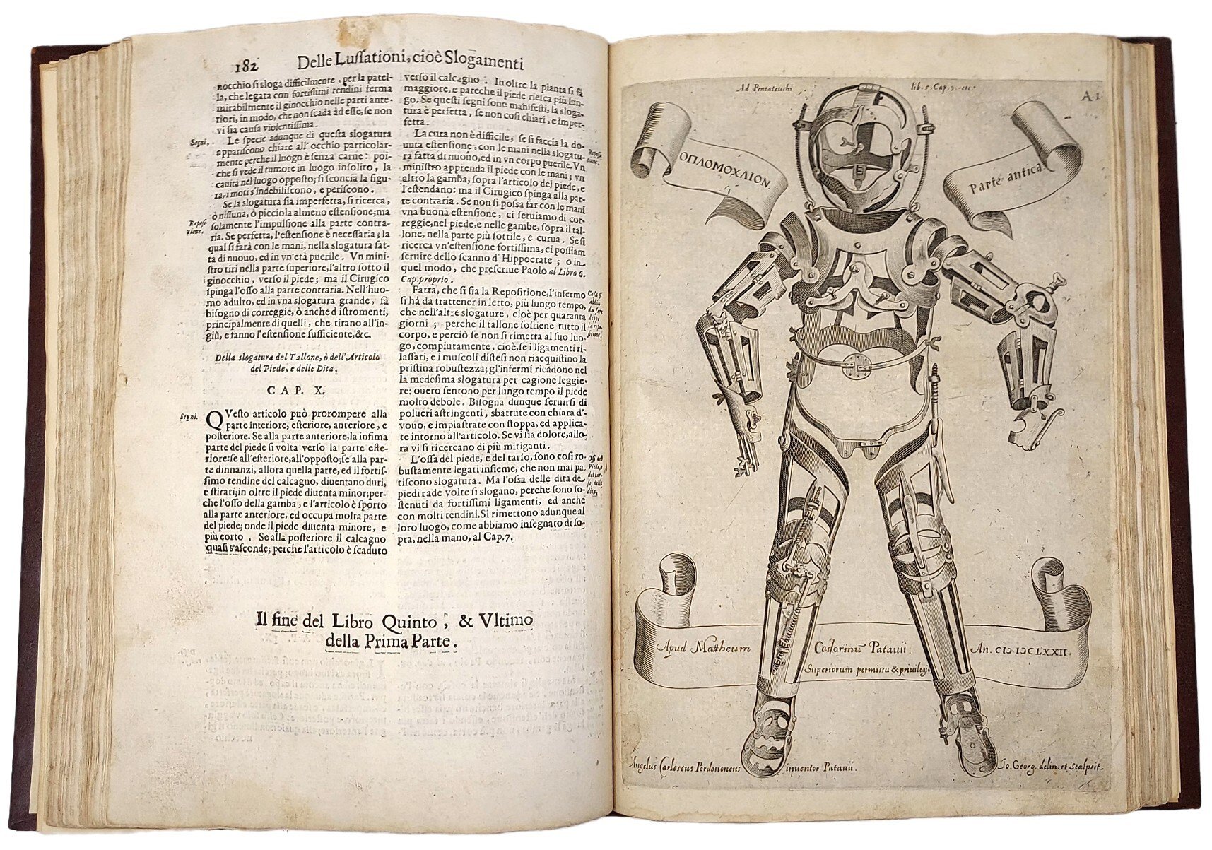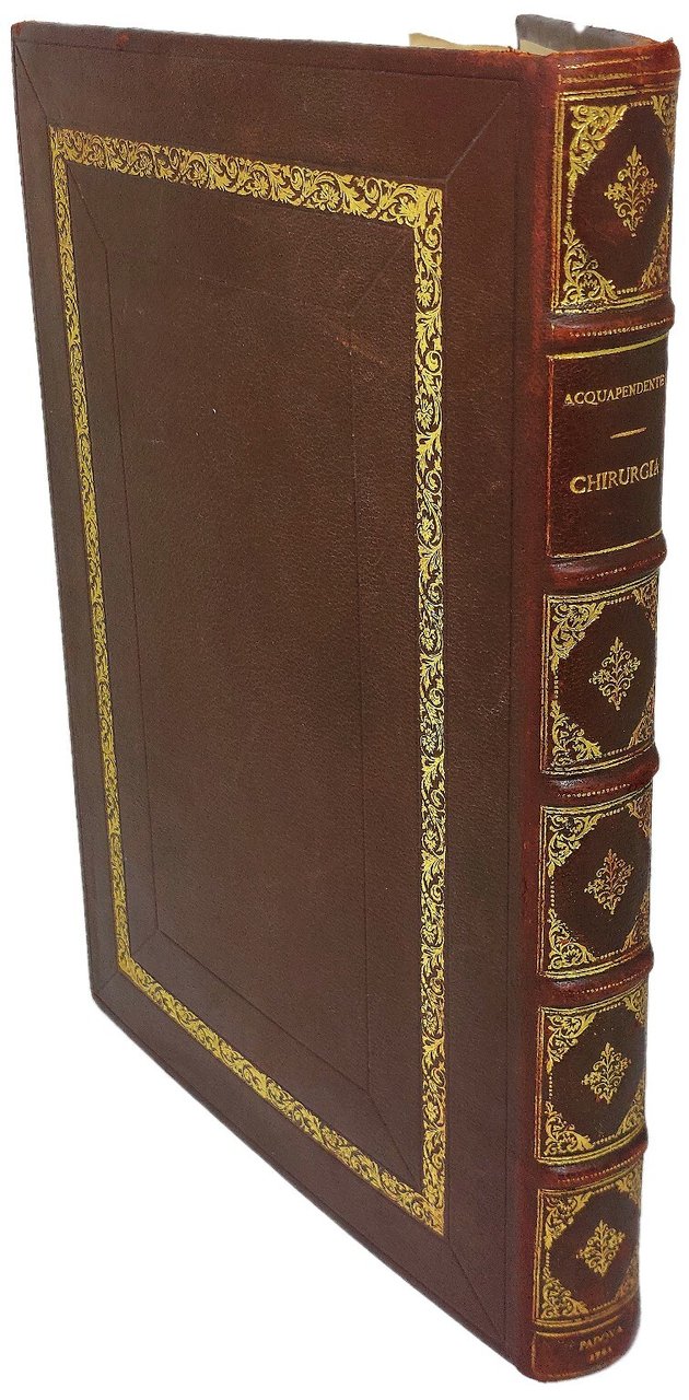 >in-folio (316x220 mm), pp. (12), 359, illustrato da vignetta inc. sul titolo e 9 magnifiche tavole a piena pagina di strumenti chirurgici inc. in rame f.testo. Elegante legatura del primo Novecento in piena pelle decorata in oro. Vasto trattato seicentesco di chirurgia, assai importante, la cui prima edizione apparve a Padova in latino nel 1641. Fabrizzi (1533-1619) fu stimato professore di anatomia e chirurgia nel famoso Studio di Padova. Pallida gora al margine esterno delle ultime pagine. Esemplare a pieni margini. Wellcome, Medical Library, III, p.4. Pazzini n.79.