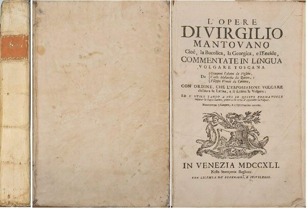 gr. vol. in folio, pp. 160, 535, bella leg. p. perg. coeva con nervi e tass. al d. Vignetta in legno al front. e iniziali. Nella prima parte compaiono 14 incis. xilogr. di illustrazione alle Egloghe. Tracce di lieve usura alle unghie ba bell'esempl. [153]