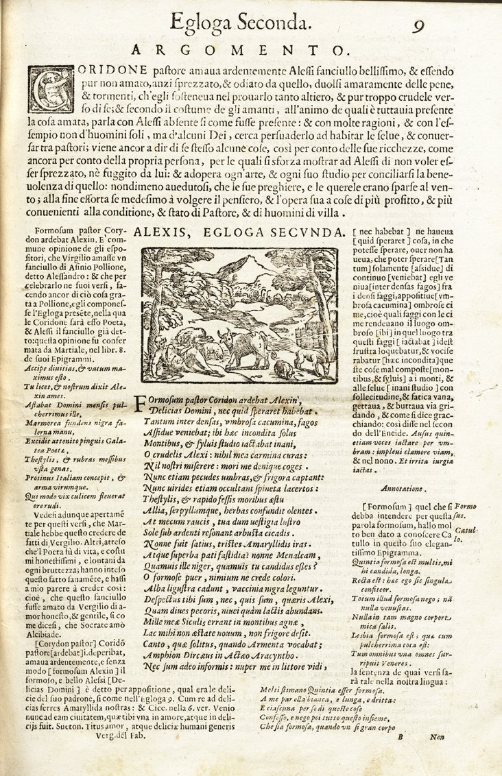 >2 parti in un vol. in-folio, ff. 100, 322 (ma i.e.326 per errore di numeraz. dopo f. 196), leg. moderna in p. pergamena rigida, dorso a nervi con tit. ms. Frontespizio a stampa rossa e nera con grande impresa tipogr., testatine, fregi, iniziali istoriate e ornate, 15 illustrazioni silografate n.t. (11 alle Egloghe, 4 alle Georgiche). Precede la Vita di Virgilio. Testo latino in car. corsivo, racchiuso dalla traduzione volgare, commento ed annotazioni in car. tondo. Pregevole edizione seicentesca delle opere di Virgilio, tradotte in italiano ed ampiamente commentate. Buon esemplare di edizione assai bella. (Piccola porzione del margine bianco esterno del titolo abilmente rifatto, lievi arrossature o aloni, forellini marginali di tarlo). Michel-Michel VIII, 221. BMC, XVII sec., 964 (stessa ediz., ma altre date). Graesse VII, 340.