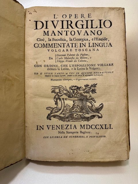 Legatura coeva in cartonato, piatti ricoperti con carta marmorizzata coeva, dorso con titolo manoscritto, copia in buonissime condizioni e con ampi margini. Piccola e sapiente integrazione all’angolo inf. ds del margine bianco nel frontespizio ma assolutamente invisibile. Vignetta xilografica al frontespizio e all’ultima carta, capilettera ornati. Quattordici graziose vignette xilografiche nel testo. Ottima edizione dell'opera omnia di Virgilio, significativa per l'importante e copioso apparato critico. Giovanni Fabrini (1516-1580), celebre umanista toscano, fu anche curatore delle opere di Orazio, Cicerone e Terenzio. Filippo Venuti (1531-1587), linguista originario di Cortona, curò anche la stesura di un celebre dizionario latino-italiano.