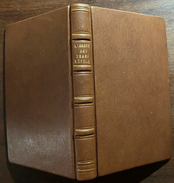 12° (cm. 14,5x9), elegante legatura moderna in cuoio con nervi e tit. in oro al dorso, fogli di sguardia marmorizzati, pp. XVIII - 140 - (2). Emblema massonico inc. al frontespizio, alcune figure n.t. e 2 grandi tavv. inc. ripiegate f.t. raffiguranti: "Véritable plan de la Loge de réception d'un Apprentif-Compagnon" e "Véritable plan de la Loge de réception d'un Maître”. Esemplare con barbe. Piccole sfrangiature all’angolo inf. esterno di qualche pagina, una minuscola, irrilevante gora lambisce appena il marg. superiore bianco di poche pagg. Esemplare peraltro ben conservato. Rara edizione di quest'operetta attribuita all'abate Louis-Calabre Pérau, per altri a Giovanni Gualberto Bottarelli; mentre infine Barbier indica come possibile autore l'Abbé Larudan. Per la datazione cfr. BNF Catalogue général.