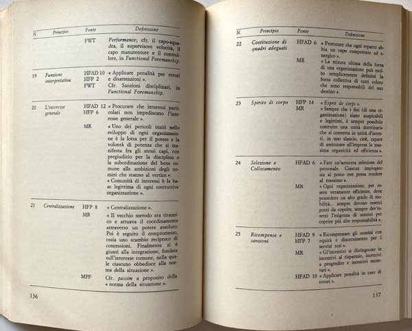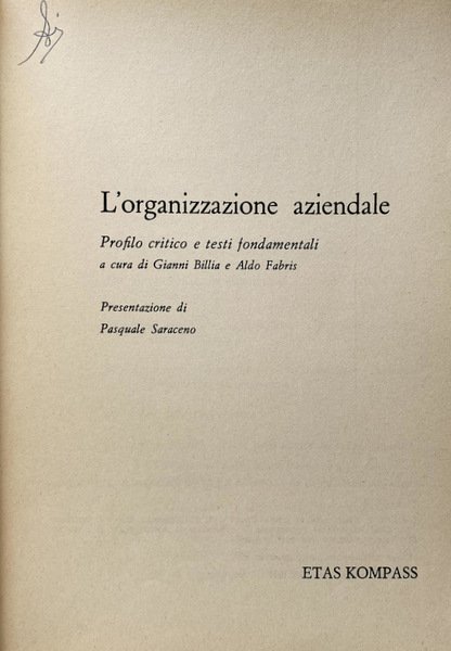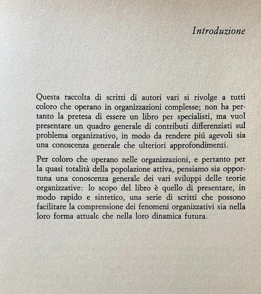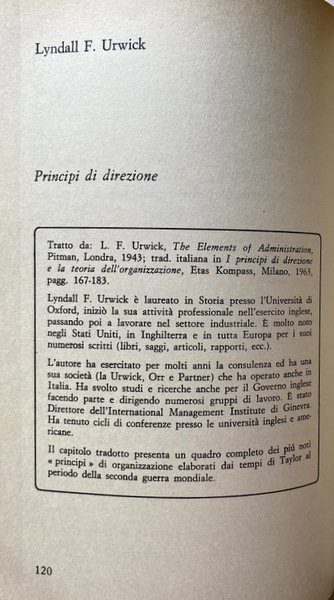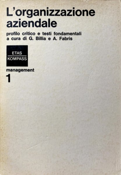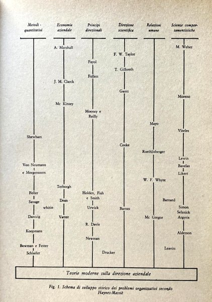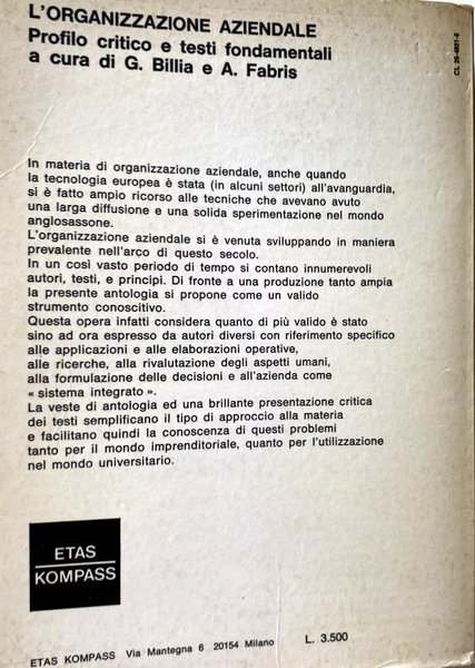 Soggetti: Gestione generale, Aziende, Organizzazione del lavoro, Economia aziendale, Sociologia, Studi economici, Principi, Direzione, Leadership, Struttura organizzativa, Sistema informativo, Tecnologie, Customer Relationship Management, Controllo di gestione, Balanced Scorecard, Marketing, Mercato, Mintzberg, Mission, Risorse umane, Processi aziendali, Processo decisionale, Aspetti umani, Strategie, Filosofia, Teorie economiche, Luther Gulik, Graicunas, Lounsbury S. Fish, Holden, Staff, Rapporti, Relazioni, Sistema integrato, Urwick, Adattamento, Dinamiche, Dickson, Barnard, Elliott Jacques, Cultura, Personalità, Responsabilità, Sanzioni, Comportamento, Autorità, Potere, Capo, Struttura sociale, Ruoli, Personale, Tensioni di gruppo, Working Through, Argyris, Leavitt, Progettazione, Reti, Scienza delle decisioni, Teoria comportamentistica, March, Cyert, Moore, Feigenbaum, Cohen, Soelberg, Modelli, Merce, Prezzi, Produzione, Produttività, Magazzino, Duopolio, Grafi, Programmazione, Progettazione, Dantzig, Kemeny, Dopoguerra, Anni Sessanta, Anni Settanta, Fabbriche, Taylor, Ford, Kast, Rosenzweig, Antologie, Raccolte, Saggi, Libri Vintage Fuori catalogo, Manuali, Studio, Classici, Riferimento, Bibliografia, Europa, America, Specializzazione, Stakeholder, Output, Performance, Pianificazione, Prestazioni, Weber, Moreno, Lewin, Marshall, Barnes, Collocamento, Vertice, Regole standard, Feedback, Vendita, Scorte, Ricompense, Premi, Dipendenti, Vita lavorativa, Comunicazione, General management, Companies, Work organization, Business economics, Sociology, Economic studies, Principles, Organizational structure, Information system, Technologies, Management control, Market, Human resources, Business processes, Decision-making, Human aspects, Strategies, Philosophy, Economic theories, Reports, Relations, Integrated system, Adaptation, Dynamics, Culture, Personality, Responsibility, Sanctions, Behavior, Authority, Power, Head, Social structure, Roles, Group tensions, Planning, Networks, Decision science, Behavioral theory, Models, Goods, Pricing, Production, Productivity, Warehouse, Duopoly, Graphs, Programming, Design, Postwar, Sixties, Seventies, Factories, Anthologies, Collections, Essays, Out of print books, Manuals, Study, Classics, Reference, Bibliography, Europe, Specialization, Planning, Placement, Summit, Rules, Sales, Stocks, Rewards, Awards, Working life, Communication