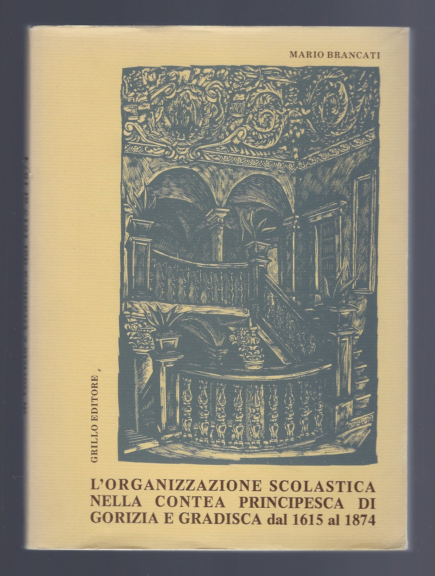 Sovraccoperta illustrata (con lo scalone interno della Biblioteca statale di Gorizia, dalla cartella di 15 xilografie-Gorizia- di Tranquillo Marangoni) con lievi segni d'uso.