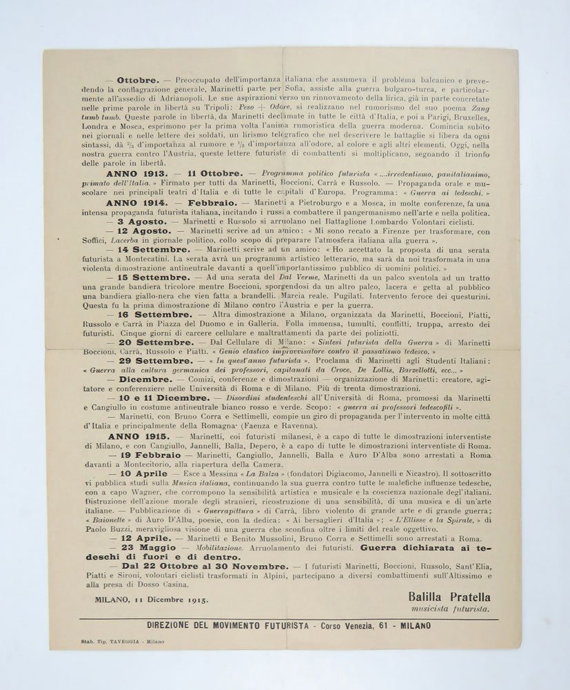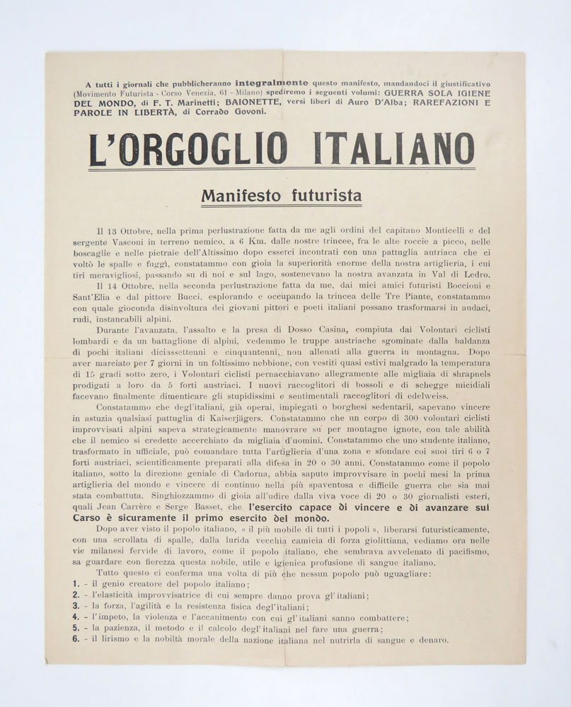 MANIFESTOEdizione originale, prima tiratura.Ottimo esemplare, fresco e pulito (un piccolo principio di separazione, senza perdite, alle piegature orizzontali e verticali è fermato da applicazione di sottile e quasi invisibile nastro “Filmoplast”).La prima tiratura si distingue per l’assenza dei due riquadri con pubblicità di «Vela Latina» posti appena sotto il titolo, a lato del sottotitolo «Manifesto futurista»; vi fu dunque una seconda tiratura identica con i riquadri di pubblicità e infine una terza stampa che oltre ai riquadri interviene con due piccole aggiunte testuali alla parte che s’intitola «Il Futurismo e la Guerra». Il dépliant infatti si compone di due parti: alle pp. [1]-[2] «L’Orgoglio italiano», manifesto originale firmato da F.T. Marinetti, U. Boccioni, L. Russolo, A. Sant’Elia, M. Sironi, U. Piatti, ovvero il gruppo dei futuristi partiti per il fronte come volontari ciclisti nell’ottobre del 1915, poi congedati a fine novembre. Alle pp. [3]-[4] «la cronaca sintetica» stilata da Francesco Balilla Pratella: dal 20 febbraio 1909 al 30 novembre 1915, in una versione di molto ampliata rispetto all’originale uscito su «Vela latina» III,46 (24 novembre 1915), e che cambierà ancora in un paio di tirature successive del manifesto e infine nella versione acclusa a «L’unica soluzione del problema finanziario», manifesto diffuso nel febbraio 1916. Il volantino dell’«Orgoglio italiano» fu diffuso assai probabilmente nel gennaio 1916 (appare su «Vela latina» n. IV,2, 15 gennaio). Tonini, I manifesti, 94.1; Tampieri, Pratella, 77
