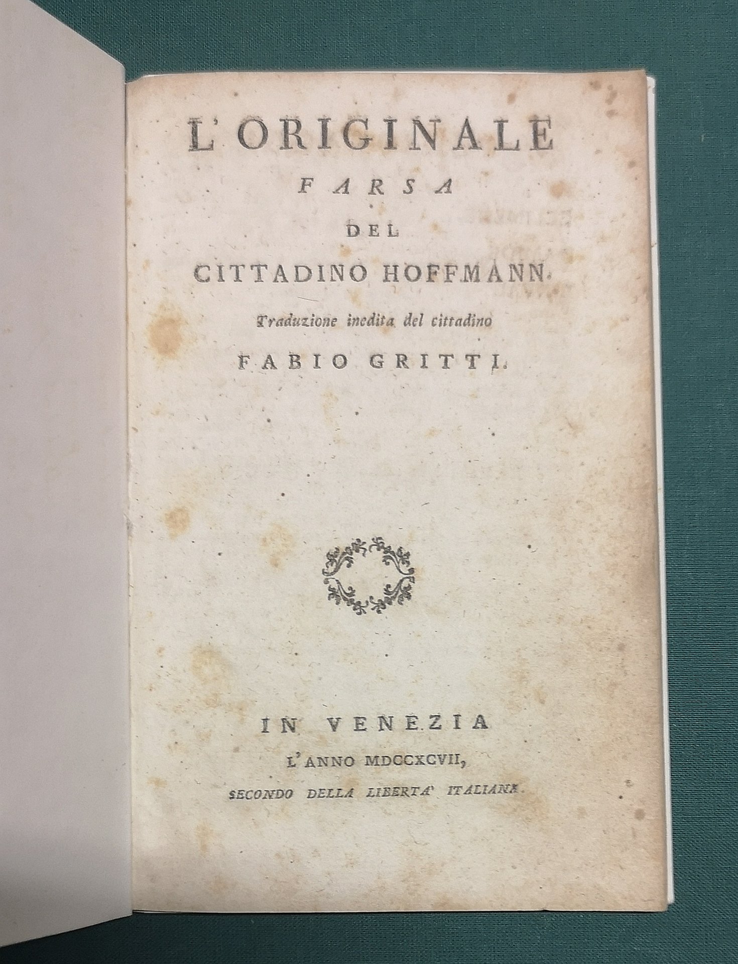 >in-8, pp. 32, leg. mod. in carta colorata. Prima edizione della traduzione italiana, ad opera di Fabio Gritti (sec. 18^), della farsa in un atto unico del critico e drammaturgo francese Francois Benoit Hoffmann (1760-1828). Gli ultimi 3 ff. contengono note storico-critiche sull'opera. (Esempl. con bruniture).