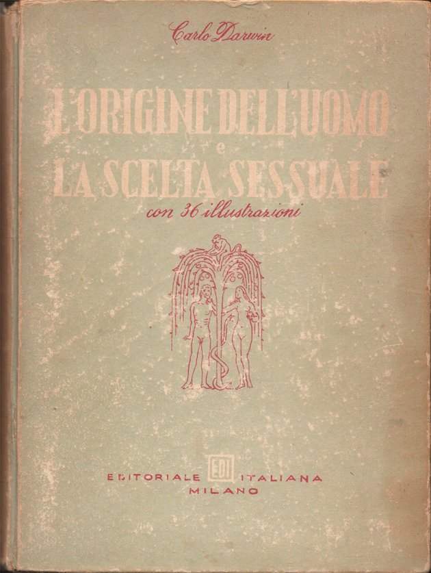 In-8° (21 x 15,5 cm) pp. 480, legatura editoriale. Segni d'uso e del tempo alla legatura, in particolare: piccoli aloni e mende; ai labbri, piccole mancanze di carta; al dorso, scurito, titoli sbiaditi. Con 36 figure in bianco e nero nel testo. Qualche piccolo segno d'umido al taglio di testa. Al foglio che ospita le pagine 173-174, piccolissimo foro, ben sistemato con carta giapponese, con, a pagina 174, reintegro, a matita, di una lettera caduta. Rinforzo in carta giapponese tra le carte di guardia e i contropiatti. Patina del tempo alle pagine, con arrossature ai margini dovute al tipo di carta. Per il resto, in buono stato. Indice: Introduzione. I. Evidenza dell'origine dell'uomo da qualche forma inferiore. II. Comparazione fra la potenza mentale dell'uomo e quella degli animali sottostanti. III. Paragone fra le facoltà mentali dell'uomo e quelle degli animali. IV. Del modo di sviluppo dell'uomo da qualche forma inferiore. V. Dello sviluppo delle facoltà intellettuali e morali durante i tempi primitivi ed i tempi inciviliti. VI. Delle affinità e della genealogia dell'uomo. VII. Delle razze umane. VIII. Principii della scelta sessuale. IX. Caratteri sessuali secondari nelle classi inferiori del regno animale. X. Caratteri sessuali secondari degli insetti. XI. Insetti, continuazione. - Ordine lepidotteri. XII. Caratteri sessuali secondari dei Pesci, degli Anfibi e dei Rettili. XIII. Caratteri sessuali secondari degli Uccelli. XIV. Uccelli, continuazione. XV. Uccelli, continuazione. XVI. Uccelli, conclusione. XVII. Caratteri sessuali secondari dei mammiferi. XVIII. Caratteri sessuali secondari dei mammiferi, continuazione. XIX. Caratteri sessuali secondari dell'Uomo. XX. Caratteri sessuali secondari dell'Uomo, continuazione. XXI. Sommario Generale e Conclusione.