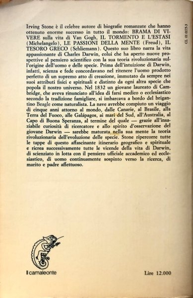 Nel 1832, all'età di ventidue anni, un giovane laureato di Cambridge, Charles Darwin (1809-1882), deciso a infrangere le tradizioni familiari che lo volevano medico o ecclesiastico, partecipa e vince il concorso per la posizione di naturalista sul Beagle, un brigantino della Royal Navy che avrebbe compiuto un lungo viaggio intorno al mondo con lo scopo di eseguire ricerche scientifiche. Dalle Canarie al Brasile, dalla Terra del Fuoco fino all'Australia passando da Capo Verde, le isole Falkland e soprattutto la Galápagos, Darwin si dedicò a raccogliere e riordinare materiale di natura biologica e geologica. Tornò cinque anni dopo carico di piante e animali ancora sconosciuti, con i quaderni pieni di appunti per quella che sarà la sua opera più importante. L'origine delle specie, pubblicata nel 1859, e destinata a scuotere le fondamenta del sapere e in particolare le teorie creazioniste fino ad allora imperanti. Irving Stone ripercorre tutte le tappe di questo affascinante itinerario, geografico e spirituale al tempo stesso, in un'attenta biografia che diventa un romanzo appassionante.