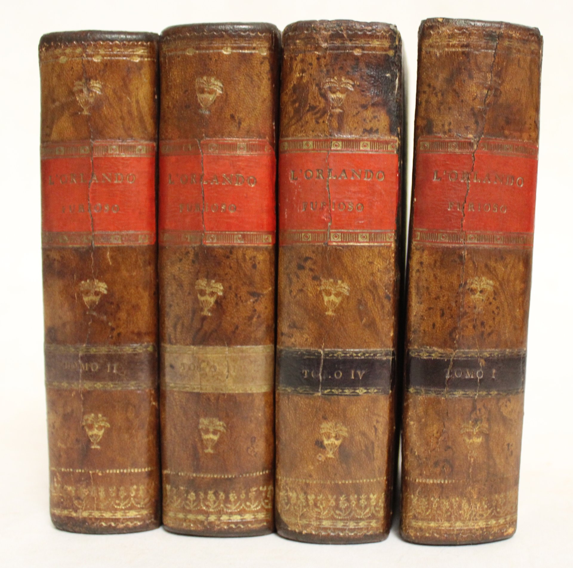 4 tomi in 8° (150x90); pagg. XLII, 438; (2), 495; (2), 458; (2), 508, antiporta con ritratto dell'Ariosto inciso in rame da Pompeo Lapi, dedica a George Mathew, 46 eleganti tavole incise finemente in rame da Giovanni e Pompeo Lapi, poste all'inizio di ogni canto, talvolta su disegno degli stessi, a volte riprese da Cochin. Le tavole sono le medesime della prima edizione di Masi del 1781 e riportano infatti in lastra la data. Elegante mezza pelle coeva con angoli, piccoli fregi neoclassici e doppio tassello al dorso con titolo ed indicazione del tomo. Stimata ed elegante edizione che riporta alla fine anche i cinque canti aggiuntivi attribuiti all'Ariosto ma da lui mai pubblicati.Buon esemplare genuino stampato su carta tendente talvolta all'azzurro, che presenta qualche lieve sporadico arrossamento. Qualche leggera traccia del tempo (piccole escoriazioni alle legature, peraltro in genere ben conservate, una cerniera un po' difettosa e alcune screpolature ai dorsi) ma complessivamente bella legatura. Non in Ferrazzi.