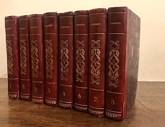 32mo (cm. 9,7), 8 Voll.; XVI-272-256-272-284-284-272-288-256 pp. Con il ritratto dell’Ariosto protetto da velina all’antiporta del primo volume. Graziose legature in mz. pelle rossa con fregi e titoli impressi in oro al ds. (minime tracce d’uso). Ex libris ai contropiatti anteriori. Lievi sporadiche fioriture, peraltro esemplare in ottimo stato di conservazione. Pregevole e non comune edizione in piccolo formato impressa ‘dai torchi di G. Didot maggiore’ nella collana ‘Biblioteca poetica italiana’. Agnelli-Ravegnani, ‘Annali delle edizioni ariostee’, I, 224.