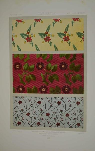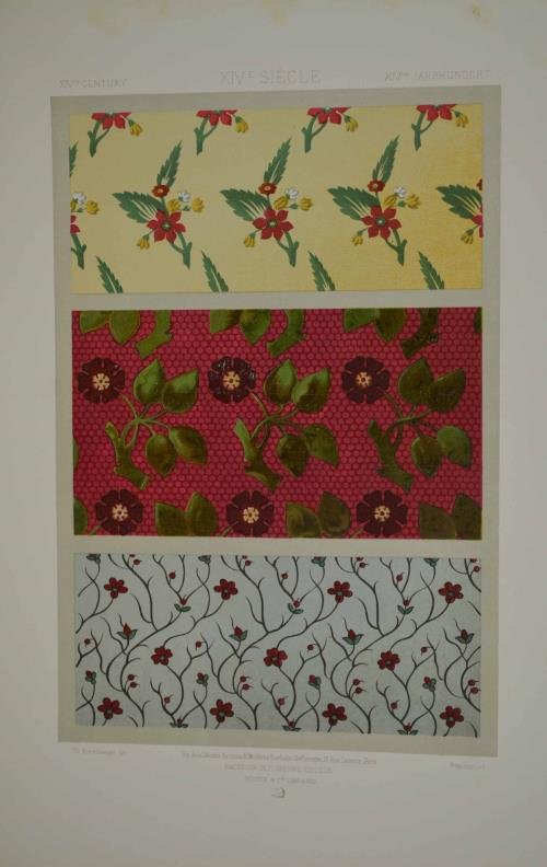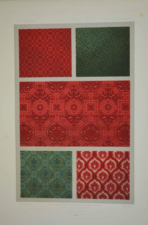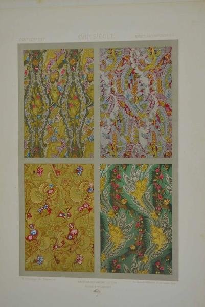 Cm. 42, pp. (4) 37 (5) + 100 splendide tavole in cromolitografia, ciascuna accompagnata da una carta di descrizione. Cartella edit. in mezza tela e cartonato a stampa con lacci di chiusura. A fogli sciolti, come d'origine. Esemplare genuino, completo e ben conservato. Raccolta storica che spiega ed illustra l’evoluzione dell’arte del tessuto dall’epoca degli egiziani all’Ottocento. Importante documento iconografico che si avvale di un’ottima qualità di stampa.