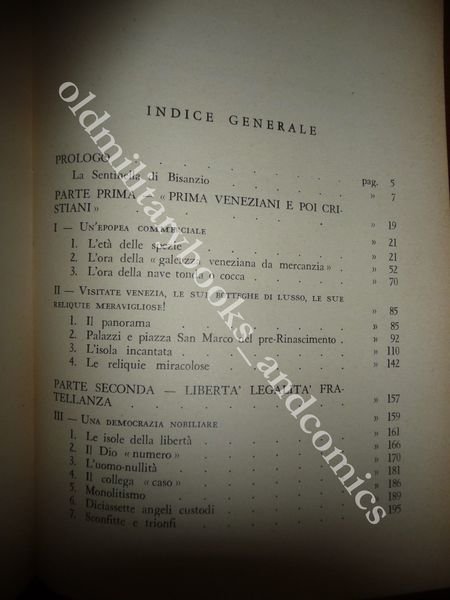 DESCRIZIONE: Massimo Ed. Milano 1961 I^ Ed. br. SENZA SOVRACC. pp. 315 con 22 tav. e carte b/n f.t. in 8°. Pubblicato in Francia nel 1959 col titolo "Splendori e miserie della Serenissima", il libro rappresenta una sorta di Romanzo della citta' e del suo mito, un viaggio nella sua storia, nelle sue istituzioni, nella sua cultura e nelle sue tradizioni. CONDIZIONI: Ottime, ma senza sovracc. PESO / WEIGHT: 503 gr. without package