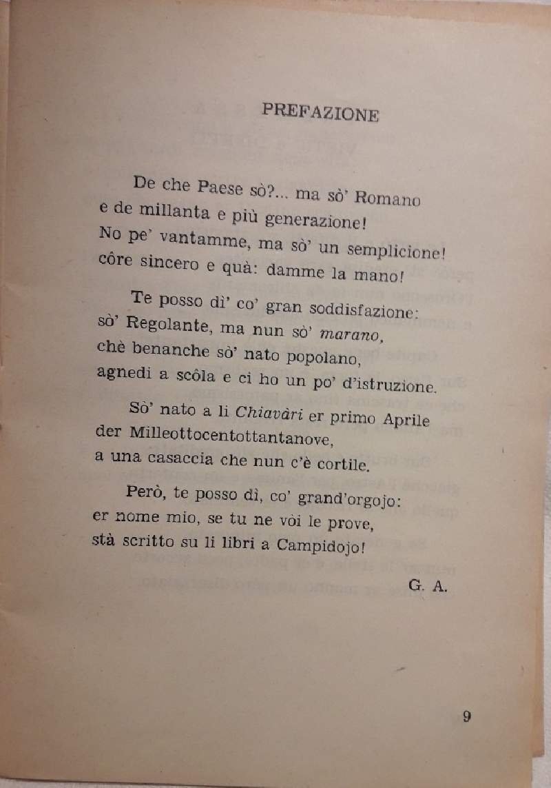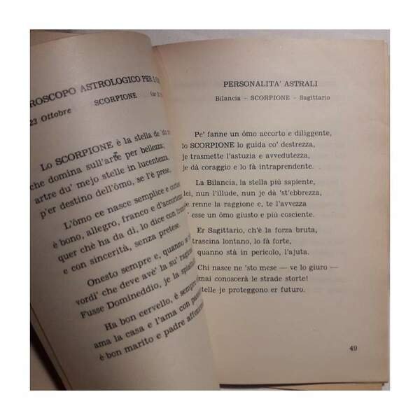 In 16', br. ed. a punta di spillo, pp. 60, 52 sonetti in dialetto romanesco, consiji per ommini e per donne; spillatura allentata, segni d'uso e del tempo, buon es. ***Due to bureaucratic reasons, books dated over 70 years old cannot be immediately exported, please contact us before placing the order.***