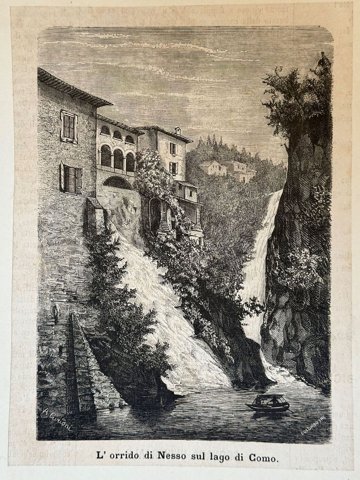 Veduta animata dell'orrido di Nesso sul lago di Como del 1860 circa. L'incisione è stata applicata su un foglio di cartone. AUTORE: Colombo su disegno di A. Curioni TECNICA: Acquaforte DIMENSIONI FOGLIO: cm 25x19,5<BR>DIMENSIONI INCISIONE: cm 19,5x14<BR>EPOCA: 1860 circa CONDIZIONI: Buone. FioritureAnimated view of Nesso on Como Lake of 1860 circa. The engraving has been applied on a carton base. AUTHOR: Colombo after A. CurioniTECHNIQUE: Etching LEAF DIMENSION: cm 25x19,5 ENGRAVING DIMENSION: cm 19,5x14 DATE: 1860 circa CONDITIONS:Good conditions. Foxing