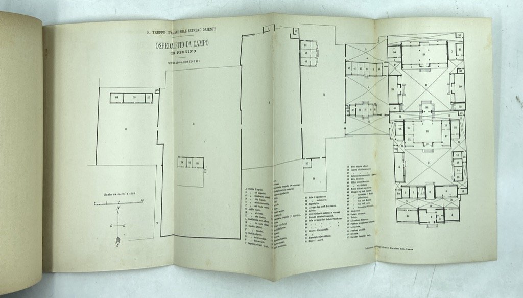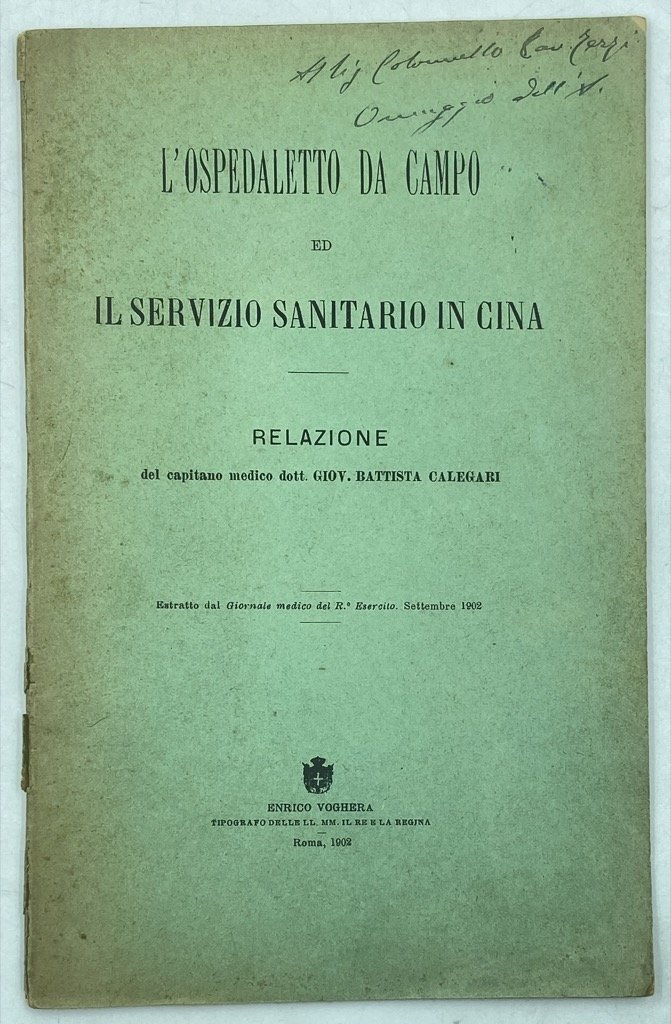 Brossura editoriale a stampa, in ottavo cm 21.5 x 13.5, pp 49 (3), una tavola ripiegata. Estratto, con propria brossura e numerazione delle pagine, dal Giornale Medico del Regio Esercito, settembre 1902. Discreto stato, rottura della brossura lungo il dorso, piccole mancanze e difetti sulla copertina, lievemente brunite le pagine. Invio autografo di omaggio dell'autore sul piatto anteriore. Interessante memoria dell’ufficiale medico Giovanni Battista Calegari, comandante dell’ospedale da campo del contingente del Regio Esercito inviato in Cina contro la rivolta dei Boxer. Il corpo di spedizione, con sede inizialmente a Tientsin e poi a Pechino, partì nella primavera 1900 e iniziò la smobilitazione nell'estate 1901. Il resoconto del capitano Calegari prende le mosse dallo sbarco nella rada di Taku, descrive l'arrivo a Tientsin, le condizioni sanitarie e le affezione morbose incontrate, i procedimenti di profilassi, la sistemazione e i locali degli ospedali a Tientsin e Pechino.