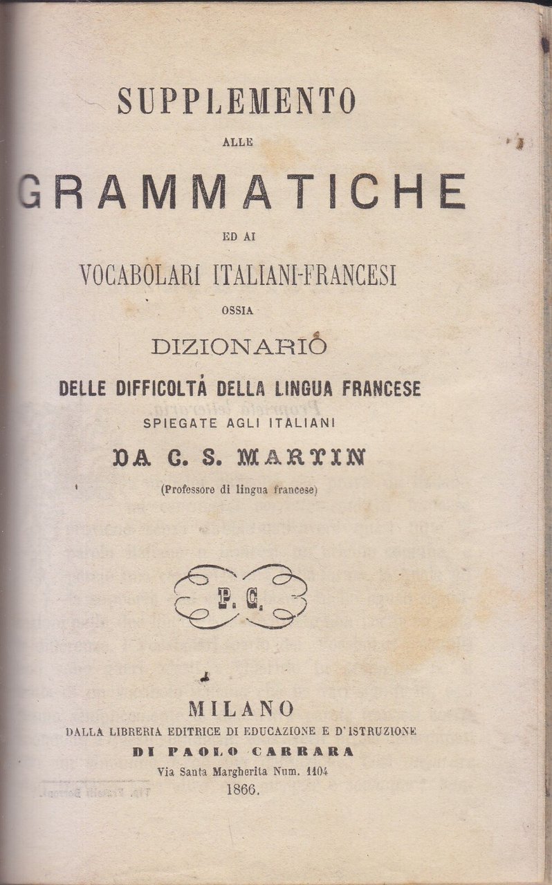 “Supplemento alle grammatiche ed ai vocabolari italiani-francesi, ossia dizionario delle difficoltà della lingua francese spiegate agli italiani” di C.S. Martin.