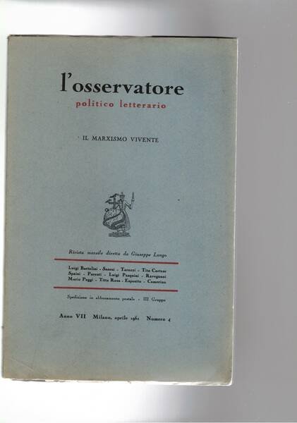 L'Osservatore politico letterario. Rivista mensile, disponiamo del fasc. dell'anno VII, n° 4 di aprile 1961. Il marxismo vivente, Note di Paolo Tarso, Giornale tedesco di Giuseppe Tarozzi, Diario americano di Roberto Sanesi; L'intrepida Clelia di L. Pasquini, canzonette di L. Bartolini, Influenza del cinema sul teatro di A. G. Bragaglia.