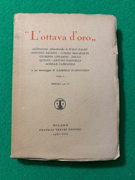 L'Ottava d'Oro, celebrazioni ariostesche di Italo Balbo, Antonio Baldini, Curzio Malaparte, Giuseppe Lipparini, Nello Quilici, Arturo Farinelli, Achille Campanile e un messaggio di Gabriele d'Annunzio, Tomo I, Ferrara 1928 - VI (Unico pubblicato)