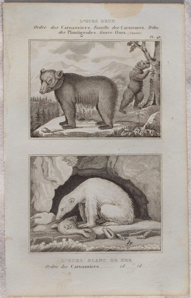 Bella incisione probabilmente della metà del XIX secolo tratta dalla monumentale opera di storia naturale di Buffon, carta spessa. L'incisione rappresenta l'orso bruno e bianco. In buone condizioni, fioriture. Usure al margine sinistro. TECNICA: Incisione DIMENSIONI FOGLIO: cm 20x12,5 DIMENSIONI INCISIONE: cm 14x9 EPOCA: 1850 circa Buffon fu un'esponente del movimento scientifico legato all'illuminismo e le sue teorie influenzarono le generazioni successive di naturalisti in particolare Jean Baptiste Lamarck e Charles Darwin. Questa è la sua opera più celebre ed è l'"Histoire Naturelle" pubblicata per la prima volta tra il 1749 ed il 1789 in 36 volumi di cui 8 postumi grazie al lavoro di Bernard Lacepede. Buffon espone tutto il sapere dell'epoca nel campo delle scienze naturali e proprio in questo scritto rilevò le somiglianze tra l'uomo e la scimmia e la possibilità di una genealogia comune. Nice engraving of probably half of the XIX century, taken from the monumental work of natural history by Buffon, wide paper. The engraving represents the Brown bear and the white bear. In good conditions, foxings. Wearings in the left edge. TECHNIQUE: Print LEAF SIZE: cm 20x12,5 PRINT'S SIZE: cm 14x9 PERIOD: 1850 circa Buffon was an exponent of the scientific movement connected to illuminism and his theories inspired the next generations of naturalists in particular Jean Baptiste Lamarck and Charles Darwin. His most famous work is l'"Histoire Naturelle" published for the first time between 1749 and 1789 in 36 volumes of which 8 are posthumous thanks to the work of Bernard Lacepede. Buffon exposes in the work all the notions in natural history and in this writing in particular underlined the similarity between monkeys and man with a possibility of common genealogy.