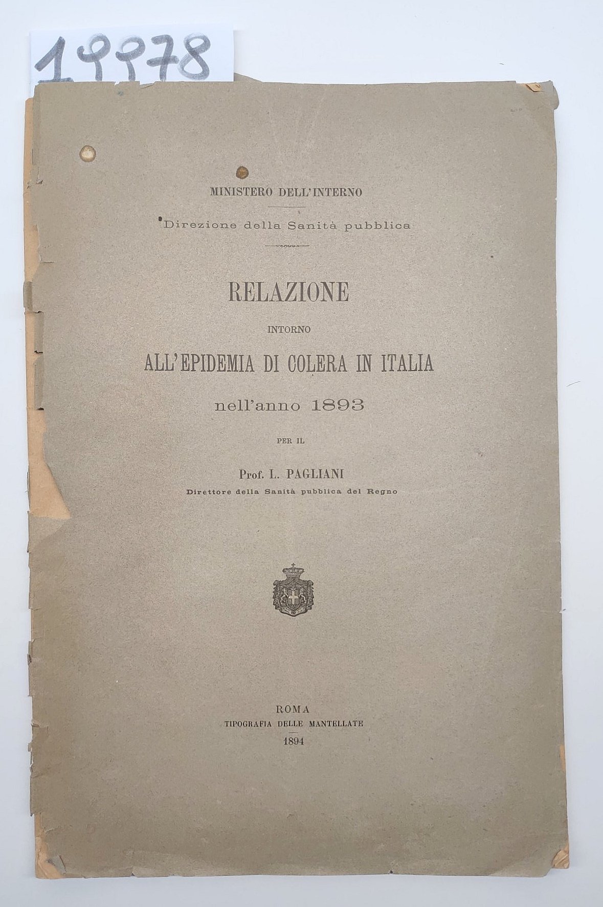 Ministero Dell'interno Direzione Della Sanità Pubblica Relazione intorno all'epidemia di colera in Italia nell'anno 1893 per il professor L. Pagliani direttore della sanità pubblica del Regno Roma Tipografia delle Mantellate 1894