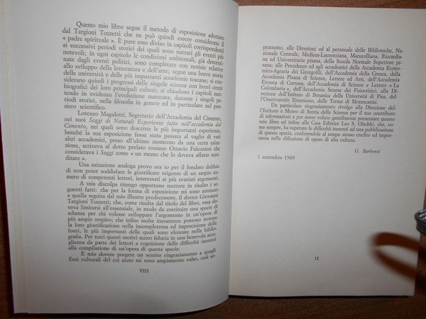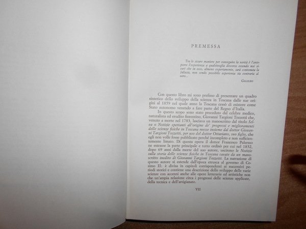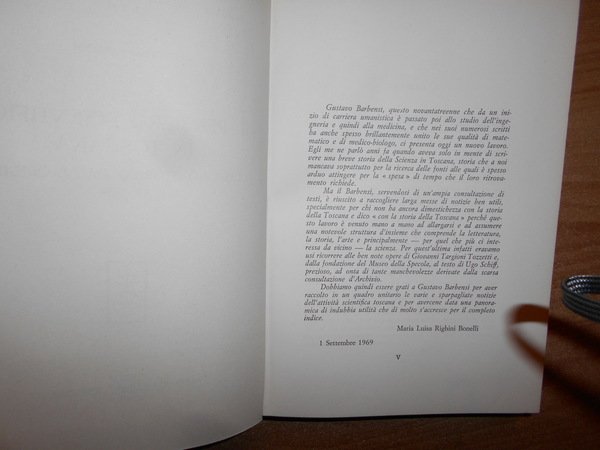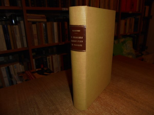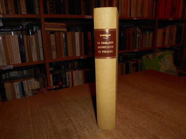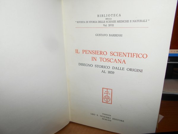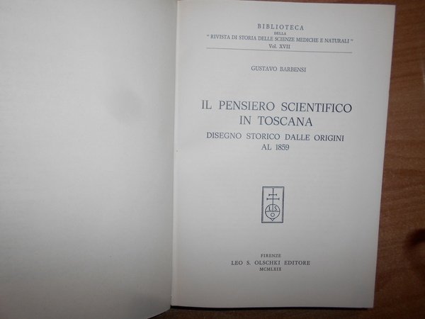 GUSTAVO, BARBENSI. Firenze, Leo S. Olschki Editore, 1969. l Pensiero Scientifico in Toscana. Disegno Storico dalle origini al 1859. In-8°, tela con titolo in oro entro tassello al dorso, copertine originali conservate con 38 tavole fuori testo e due tavole genealogiche. Come nuovo in legatura recente. Uff. D - III - 6 - 2