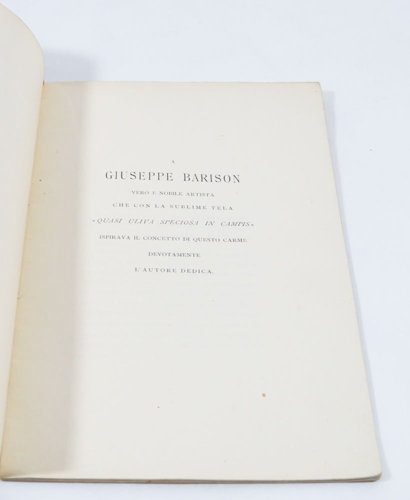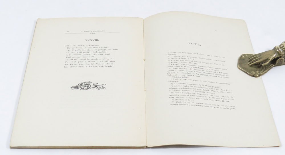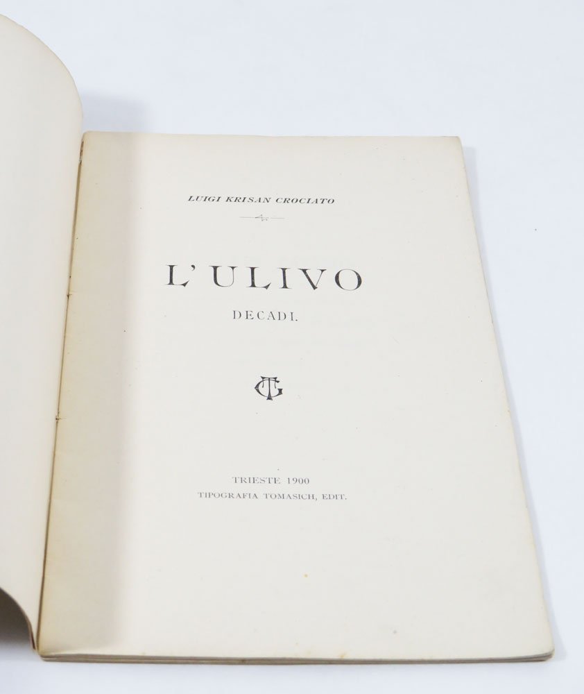 LIBROEdizione originale.Minimi segni d’usura, fioriture e piccolissime mancanze marginali alla copertina; per il resto ottimo esemplare.Rarissima opera prima. Due sole copie in Iccu, entrambe a Trieste. Poemetto in trentotto stanze numerate in settenari ed endecasillabi, con erudita prefazione dell’autore e robusto apparato di note. L’autore aderì al futurismo fin dal 1910, per poi allontanarsene e coltivare la vena mistico-religiosa (Diz. Fut.). «Quel che pare più interessante nel Crociato è la transizione da modi di derivazione, oppur consonanza, tardo-scapigliata (cosa alquanto singolare, data l’eccentricità dell’area d’appartenenza, quella triestina), a forme che rasentano l’imagerie del futurismo prima maniera, quella caratterizzata da simbolistici modi [.]. Gli esiti saranno sovente liberty [.]» (Viazzi).Viazzi, Dal simbolismo al déco, p. [525] ss- e bibl. s.v.; Cammarota in Diz. Fut. s.v. Krischan
