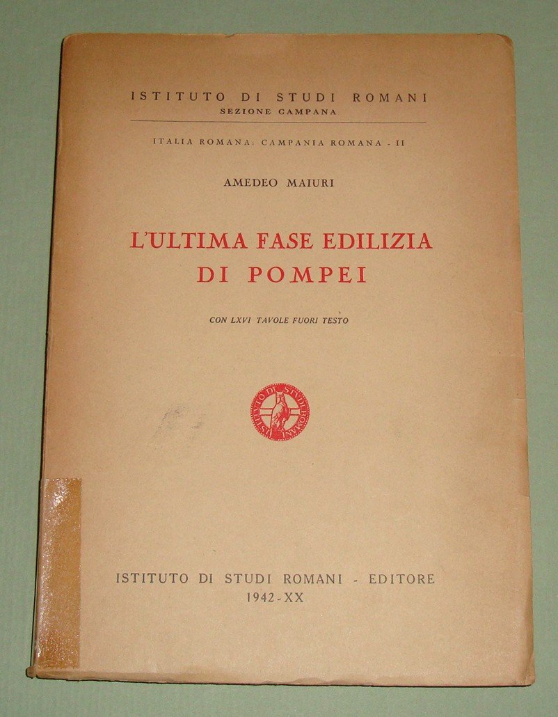 Maiuri Amedeo. L'ultima fase edilizia di Pompei. Con LXVI tavole fuori testo. Spoleto, Istituto di Studi Romani, 1942. In 8vo; pp.226 e 61 tavole fuori testo. Illustrazioni nel testo. Cart. editoriale.