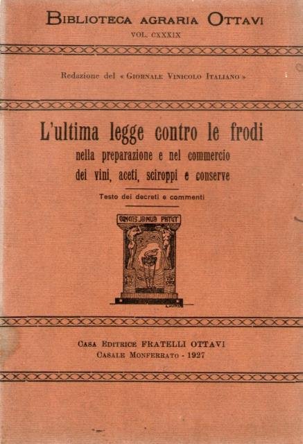 Biblioteca Agraria Ottavi, Casa Editrice Fratelli Ottavi, Casale Monferrato, 1927. In 12esimo, pp. 107 (con Indici), bross. edit. in carta marrone con titoli in nero. Interessante e poco comune compilazione in materia di illegittimità nel campo vinicolo. Etichetta della Casa Editrice Fratelli Ottavi. Non comune. Usuali segni del tempo ma buono.