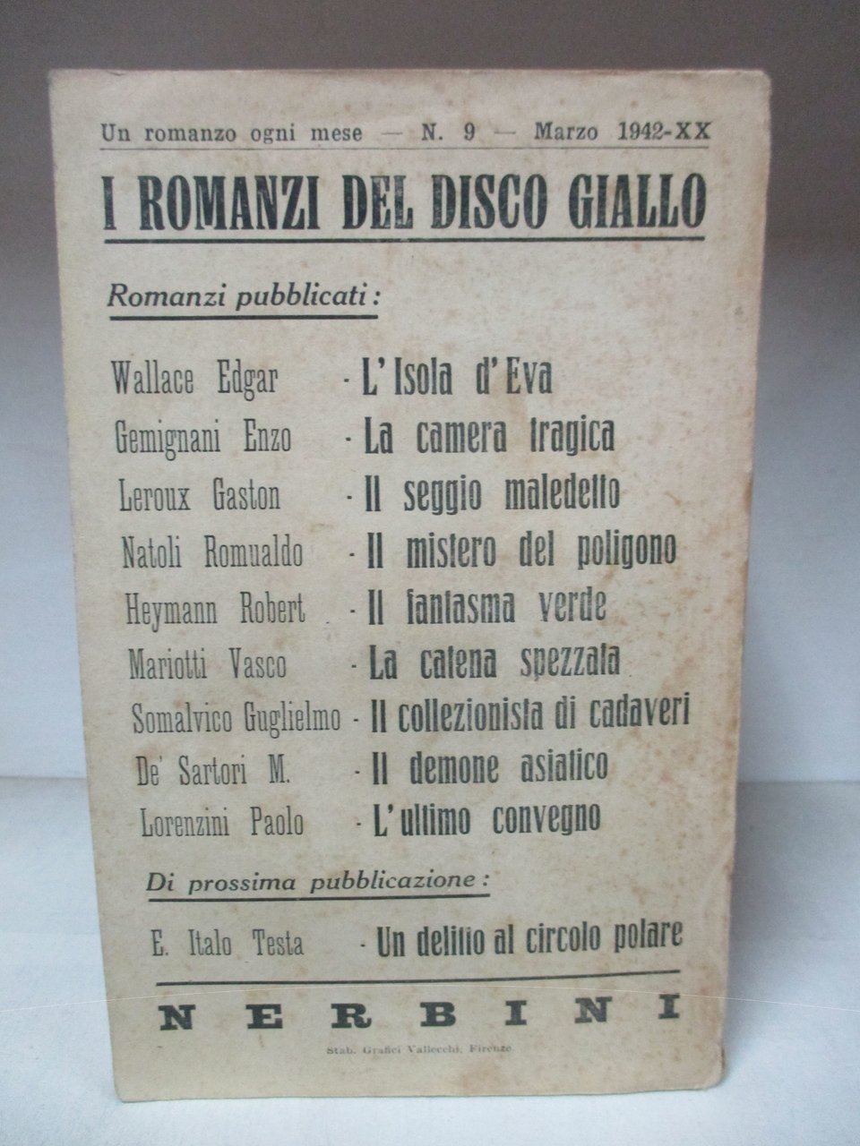 In – 16mo, brossura editoriale illustrata, pp. 240. Edizione originale. Collana " I Romanzi del Disco Giallo " vol. IX. In appendice il racconto “ Alla prova “, dello stesso Autore, e l’inizio de “ Il tamburo fantasma “, di Raymond Knotts, che termina nel numero seguente della collana.
