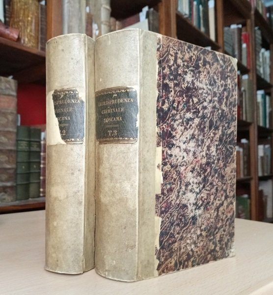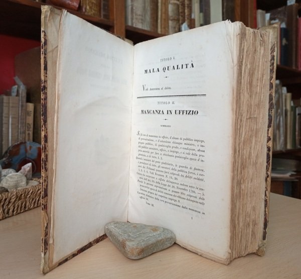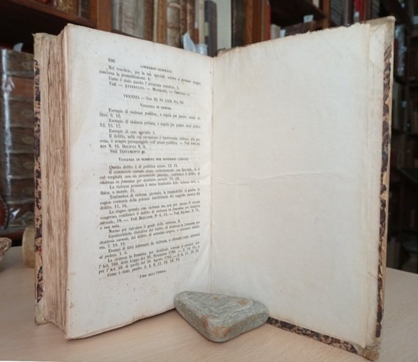 Due volumi in 4 legati in mezza pergamena, titolo al tassello ai dorsi, sguardie, occhielli, frontespizi, 856, 996 pp., bianche finali. L'opera, in ordine alfabetico, mancante del primo volume perci inizia con il reato di Danno sino a quello del Lotto (falsificazione). Il secondo tomo va dalla Mancanza in uffizio al Patricidio e dal Parto alla Violenza carnale. Rara fioritura della carta, lievi mende alle legature, mancanza di parte del tassello del II vol., in buono stato, in barbe, molto interessanti e non facilmente reperibili.