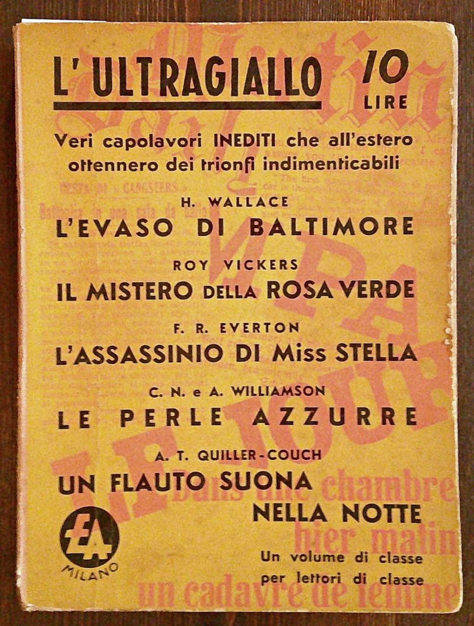 L'ultragiallo. Veri capolavori inediti che all'estero ottennero dei trionfi indimenticabili. Collezione di Capolavori Gialli creata e diretta da Carlo Brighenti. H. Wallace: L'evaso di Baltimore; Roy Vickers: Il Mistero della rosa verde; F. R. Everton: L'assassinio di Miss Stella; C. N. e A. Williamson: Le perle azzurre; A. T. Quiller-Couch: Un flauto suona nella notte. Ed. Attualità - Milano, 1938. Brossura editoriale con lievissimi segni del tempo alle copertine. Peraltro interno freschissimo e pulito. 18x24; pp.299. Buonissimo stato. , Molto buono (Very Good)