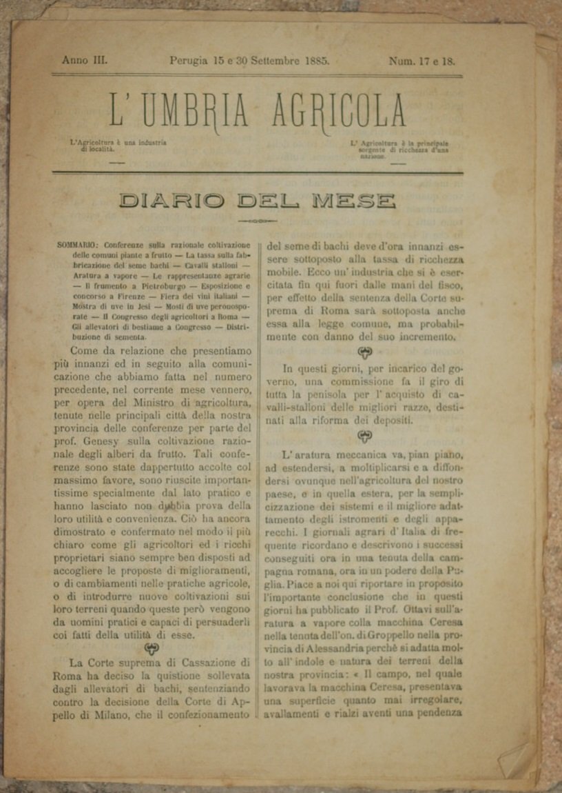 L'UMBRIA AGRICOLA GIORNALE DI ECONOMIA RURALE E DELLE INDUSTRIE CAMPESTRI ANNO III - NUM. 17 E 18 15 e 30 SETTEMBRE 1885