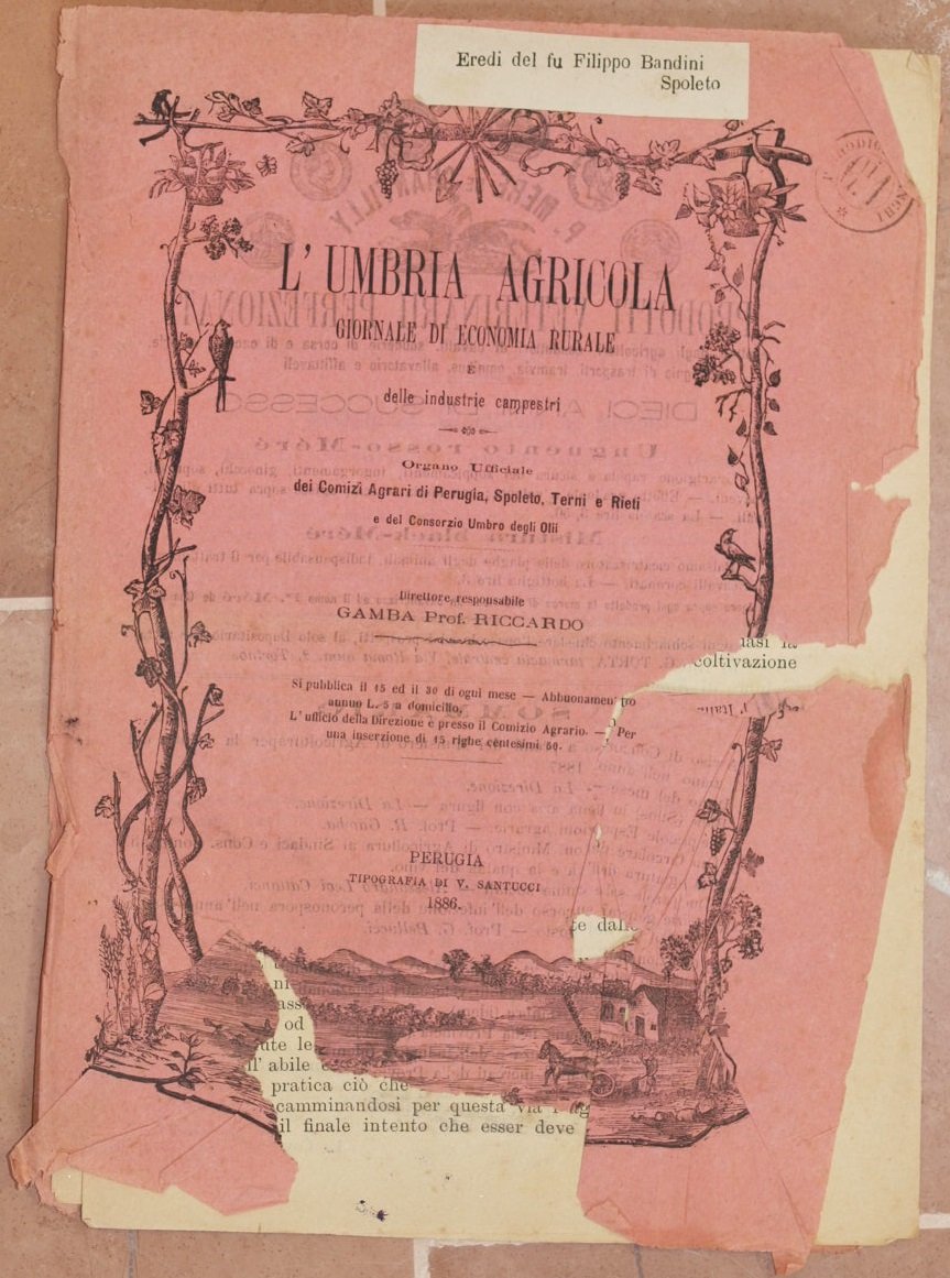 In 4. Dim. 27x19 cm. Pp. da 145 a 160. Numero del 15 e 30 ottobre 1886 de "L'Umbria agricola", rivista bisettimanale di economia rurale diretta da Riccardo Gamba. La rivista conteneva numerosi articoli di agricoltura e allevamento, molti di interesse locale. In questo numero: La filossera a Pallanza, Le pecore dell'Australia in Italia, Stalloni governativi, Nuova crittogama delle viti, Congresso a Firenze, Etichette francesi contraffatte, Trasporto ferroviario dell'uva, La emigrazione italiana, Esportazione di uve, Il raccolto del granoturco, Prestiti per le Scuole pratiche di agricoltura, Inoculazioni carbonchiose, L'alcoolizzazione dei vini, Per l'alimentazione dei contadini, I grani all'estero ecc. Etichetta al piatto anteriore. In buone condizioni. Brossura editoriale in discrete condizioni generali con strappi e parti mancanti ai margini e dorso. Piegatura orizzontale. Legatura assente. Pagine in buone condizioni con rare fioriture. Piegature e strappi marginali. Number of the 15th and 30rd of october 1886 of "L'Umbria agricola", biweekly magazine of rural economy directed by Riccardo Gamba. The magazine contained different articles of agriculture and breeding, many of them of local interest. In this number: filossera in Pallanza, Sheeps of Australia in Italy, New crittogama of grapes, Congress in Florence, Fakes french labels, Railway transport of grape,Italian emigration, Harvesting of grapes, Practical schools of agriculture, Inoculation of anthrax, Alcohol of wines, About food of peasants etc. Label in the front plate. In good conditions. Editorial cover in poor general conditions with tears and missing parts in the edges and spine. Horizontal folding. Binding is missing. Pages are in good conditions with foxings. Foldings, tears and wearings in the edges.