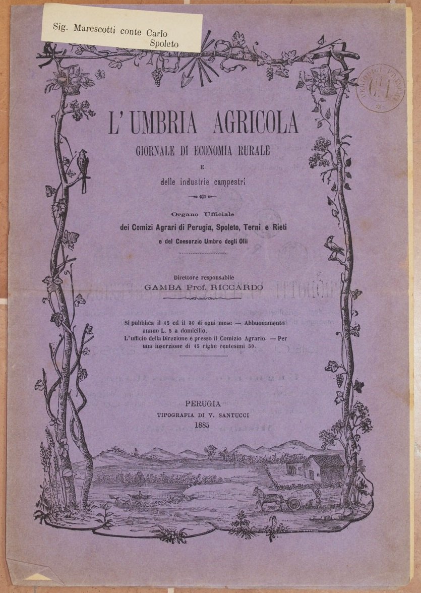 L'UMBRIA AGRICOLA GIORNALE DI ECONOMIA RURALE E DELLE INDUSTRIE CAMPESTRI ANNO IV - NUM. 22 PERUGIA 15 OTTOBRE 1885