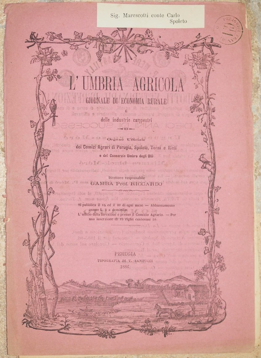 In 4. Dim. 27x19 cm. Pp. da 49 a 64. Numero del 15 e 30 aprile 1886 de "L'Umbria agricola", rivista bisettimanale di economia rurale diretta da Riccardo Gamba. La rivista conteneva numerosi articoli di agricoltura e allevamento, molti di interesse locale. In questo numero: Industria e commercio degli olii, Esposizione universale e Congresso di orticultura, Semi di viti americane, Società dei viticoltori italiani, Per il bestiame, Raccolta dell'olio di oliva ecc. Brossura editoriale originale. Brossura editoriale in buone condizioni con lievi usure ai margini e dorso. Piegatura orizzontale. Legatura assente. Pagine in buone condizioni con rare fioriture, ancora unite fra loro. Piegature ed usure marginali. Number of the 15th and 30th of april 1886 of "L'Umbria agricola", biweekly magazine of rural economy directed by Riccardo Gamba. The magazine contained different articles of agriculture and breeding, many of them of local interest. In this number: Industry and trade of oils, Unviersla exposition and trade, Seeds of american grape, Society of italian grape cultivators, For cattle, Olive oil harvesting ecc. Editorial original cover. Editorial cover is missing. Horizontal folding. Binding is missing. Pages are in good conditions with foxings, still bound together. Foldings and wearings in the edges.