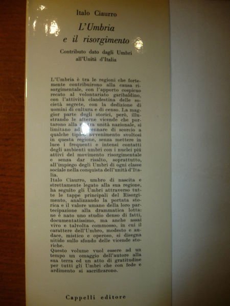DESCRIZIONE: Cappelli Ed. Rocca San Casciano 1963 I^ Ed., br. ed. con sovracc. ill. con alette, pp. 319 con alcune ill. b/n f.t. in 8°. L'Umbria è fra le regioni che fortemente contribuirono alla causa risorgimentale, con l’apporto cospicuo legato al volontariato garibaldino, con l’indefessa attività clandestina delle società segrete, con la dedizione di uomini di cultura e di censo. A partire dal periodo rivoluzionario napoleonico fino alla Roma italiana, il territorio umbro è stato protagonista di indomite iniziative troppo spesso trascurate dagli storici: dalle insorgenze antifrancesi di Gubbio nel 1797 all’adesione di Terni alla Repubblica romana nel 1798; dalla rivolta di Foligno del 28 febbraio 1831 a quella di Perugia dell’8 maggio 1833; le epiche giornate del giugno del 1859 fino alla disperata capitolazione del 20 giugno di Perugia (la quale è la nona fra le 27 città decorate con medaglia d’oro come “benemerite del Risorgimento nazionale”); la partecipazione di sei umbri alla spedizione dei Mille, di un orvietano all’impresa di Sapri e di un perugino all’azione ardita dei fratelli Bandiera; la liberazione dell’Umbria nel 1860 (da Città di Castello fino a Narni); le figure mitiche del Risorgimento umbro: tra gli altri le res gestae del generale garibaldino Luigi Masi, il marchese Gualterio di Orvieto, il conte Massarucci di Terni, la famiglia Bruschi e Francesco Guardabassi di Perugia, Cesare Agostini di Foligno, Giovanni Froscianti, mitico attendente di Garibaldi e Pietro Faustini, grande combattente ternano. Infine, una bellissima storia d’amore: quella che condusse la ventenne Colomba Antonietti di Bastia a morire in difesa della Repubblica romana, vestita da uomo vicino al marito combattente Luigi Porzi; unica donna presente fra i busti risorgimentali del Gianicolo. “Il Risorgimento è passato per l’Umbria”; e gli Umbri “credevano”. Indice completo in foto. CONDIZIONI: Ottime, volume rarissimo in I^ edizione, quella che proponiamo. PESO / WEIGHT: 332 gr. without package