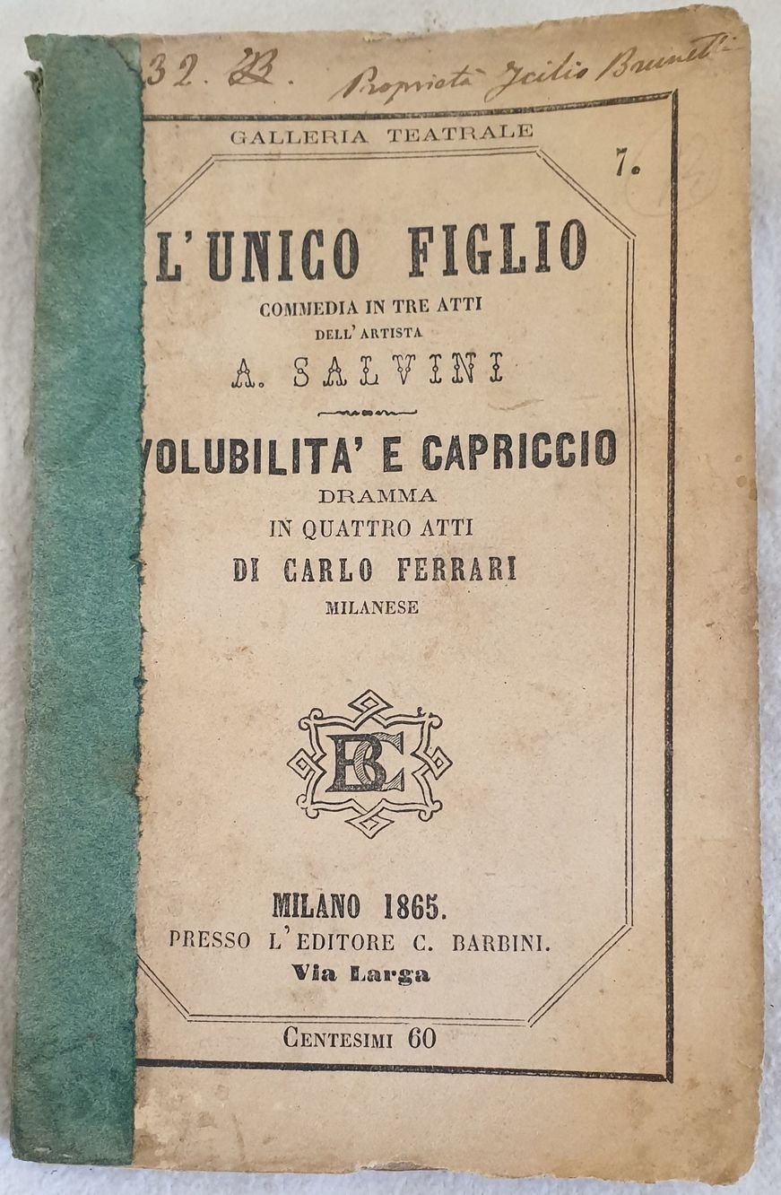 Edizione del 1865 di due opere teatrali: "L'unico figlio" scritto da Salvini. La seconda opera è "Volubilità e capriccio" di Carlo Ferrari. Antiche note manoscritte in copertina. In discrete condizioni. Copertina editoriale in buone condizioni generali con lievi usure ai margini e dorso coperto da carta. Legatura in buone condizioni. All'interno le pagine si presentano in buone condizioni con rare fioriture. Frontespizio attaccato al piatto anteriore. In 16. cm 15,5x10. Pp. 151Edition of 1865 of two booklets: "L'unico figlio" written by Tommaso Salvini (1829-1915), theatre actor and patriot. The second work is "Volubilità e capriccio" by Carlo Ferrari. Antique handwritten notes in the cover. In fair conditions. Editorial cover in good general conditions lightly worn in the extremities and spine covered with paper. Binding in good conditions. Inside pages are in good conditions with occasional foxing. Title page attached in the front plate. In 16. cm 15,5x10. Pp. 151