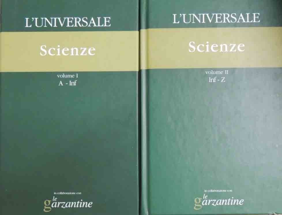 L’Universale. La grande enciclopedia tematica. Scienze, Il Giornale, Milano 2003, 2 voll., pp. 1531, ill. b.n., cm 23, cart. ed. con titoli al dorso e al piatto. Collana L’Universale. La grande enciclopedia tematica, nn. 10-11. Vol. I: A-Inf. Vol. II: Inf-Z. Edizione speciale realizzata per Il Giornale su licenza della Garzanti Libri S.p.A. Un colpetto alla legatura del secondo volume, leggera ingiallitura della carta, per il resto ben conservati.