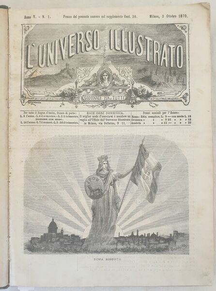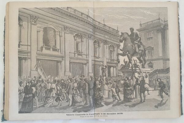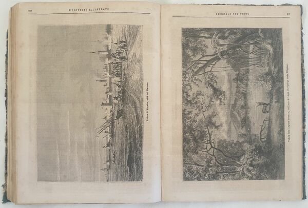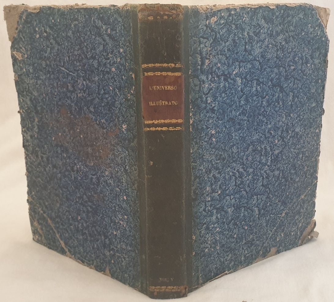 Rara raccolta dell'anno 1870 di questa interessante rivista settimanale di storia, storia naturale, arte e viaggi "L'universo illustrato". Le riviste contenevano numerosi articoli corredati di diverse incisioni nel testo. La raccolta comprende 51 numeri dal 2 Ottobre 1870 al 24 settembre 1871. Tra gli articoli presenti, la gran parte corredati da incisioni: Colosseo, L'eclisse totale di sole del 22 dicembre 1870, L'elettricità e le sue applicazioni, Naufragio della corazzata inglese "Captain", La cupola di San Pietro, La selva nera (Lago Titi, Rupi di Kussenstein, Friburgo, Simonswald, Wimpfen) Telegrafo solare di Sgarzi, Marakesh, Il castello di Verzuolo, Castel Sant'Angelo, La grotta dei Leoni ad Elefanta, Colle di Pertus in Spagna, Angelo Brunetti detto Ciceruacchio, Ritorno della spedizione tedesca al Polo Nord, Catania, Dintorni di Parigi, La casa di cola di Rienzo, Marsiglia, L'istituto forestale di Vallombrosa, Le vittime del Monte Bianco, Rouen, Il politeama genovese, le renne, La spedizione russa contro i Beks di Shagrissiabs, Il castello di Chillon, Galileo a Padova, L'eclissi del 22 dicembre, La villa di Plinio Giardini del Boccaccio, Pola e Rovigo, La vigilia del Natale a Napoli, Lo Zambese ed i suoi affluenti, I recenti terremoti nelle Romagne, Mercadante, un alga delle palude Pontine, Melegnano, Nachtigall e Valpreda nel Bornù, Traforo del Cenisio, Pompei, La fontana di Ciano, gli aerostati nelle guerre, le barelle per i soldati ammalati e feriti, La gola e le sponde di Cazan, L'Havre, Le industrie venete e il Professore Alberto Errera, Treveri, L'emigrazione in Italia, caccia in Persia, L'esposizione marittima di Napoli, Lido di Venezia, Georgetown nel Colorado ecc. Rara raccolta. In buone condizioni e completo di tutte le pagine. Copertina in mezza pelle con titolo e decorazioni in oro al dorso in buone condizioni generali con usure ai margini e dorso. Legatura in buone condizioni. All'interno le pagine si presentano in buone condizioni con rare fioriture. In 4. Dim. 31x23 cm. Pp. 1034. Scarce collection of the year 1870 of this interesting weekly magazine of history, natural history, art and voyages the "L'universo illustrato". The magazines contained different articles with different engravings in the text. The collection contains 51 numbers from the 2th of october 1870 until 24th of september 1873. Different articles inside, some with prints: Colosseo, Total eclypse of sun of the 22nd of december 1870, Electricity and its applications, Church of San Pietro, Black forest (Lago Titi, Rupi di Kussenstein, Friburgo, Simonswald, Wimpfen) Solar telegraqph of Sgarzi, Marakesh, Castle of Verzuolo, Castel Sant'Angelo, Elefanta, Pertus in Spain, Angelo Brunetti also known as Ciceruacchio, Return to Polar expedition, Catania, surroundings of Paris, the house of Cola di Rienzo, Marsiglia, Forest institute in Vallombrosa, Victims of Monte Bianco, Rouen, Il politeama genovese, russian expedition against Beks of Shagrissiabs, the castle of Chillon, Galileo in Padoa, the eclypse of the 22nd of december, La villa di Plinio Giardini of Boccaccio, Pola and Rovigo, Christmas in Naples, Zambese and its rivers, recent earthquakes in Romagne, Mercadante, Melegnano, Nachtigall and Valpreda in Bornù, Traforo del Cenisio, Pompei, Fontain of Ciano, aerostats in wars,L'Havre, Veneto idnustries and Alberto Errera, Treveri, Emigration in Italy, hunting in Persia, Sea exposition in Naples, Lido di Venezia, Georgetown in Colorado. Scarce collection. In good conditions and complete Half leather cover with golden title and decorations in the spine in good general conditions lightly worn i the extremities. Binding in good conditions. Inside pages are in good conditions with occasional foxing.In 4. Dim. 31x23 cm. Pp. 1034.