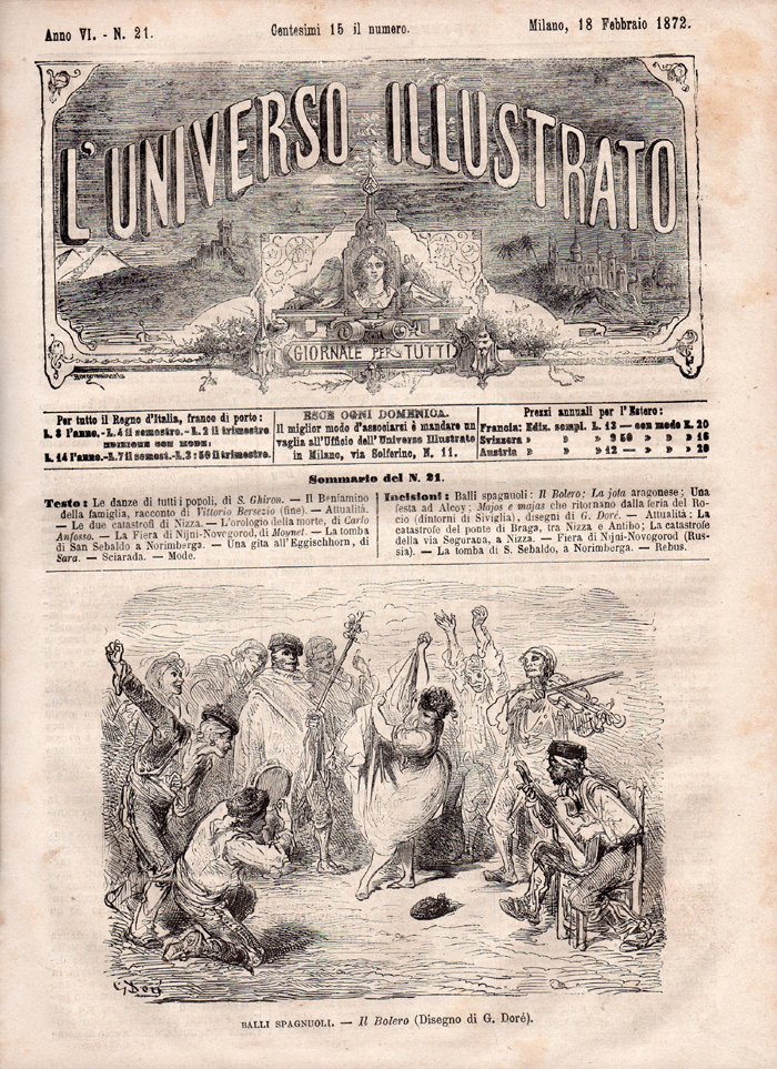 In-4°, pp. 16 (da p. 329 a p. 344). Fascicolo completo proveniente da rilegatura, illustrato da incisioni in bianco e nero. Normali segni d'uso e del tempo, per il resto, ben conservato. Sommario: Le danze di tutti i popoli: Danze e balli spagnuoli, di S. Ghiron, con quattro incisioni da disegni di G. Doré raffiguranti "Balli spagnuoli - Il Bolero", "Balli spagnuoli - La jota aragonese", "Balli spagnuoli - Una festa ad Alcoy", "Balli spagnuoli - Majos e majas che ritornano dalla feria del Rocio (dintorni di Siviglia)"; Il beniamino della famiglia, racconto di Vittorio Bersezio (continuazione e fine, vedi n. 20); Attualità: Mondo letterario (si informa dell'uscita del primo volume de La vita e i tempi di Daniele Manin, di Alberto Errera e Cesare Finzi, si elogia il volume Precetti di Letteratura Italiana del prof. Giuseppe Marini, si comunica l'uscita del libro Viaggio nel Mar Rosso e tra i Bogos, di Arturo Issel) - Concorsi (si dà notizia del tema del concorso indetto dalla Reale Accademia di scienze morali e politiche di Napoli) - Mondo teatrale (si dà brevemente conto della riuscita di una rappresentazione delle opere Aida, di Giuseppe Verdi, andata in scena alla Scala di Milano l'8 febbraio 1872, Perché al cavallo gli si guarda in bocca?, di Leopoldo Marenco, La mano tira e il diavolo coglie, di Tommaso Cambray-Digny, Cola Montano, di Ulisse Poggi, Debit paga debit di Filippo Villani, Pina la madonnina, di Fernando Fontana, Evelina, del maestro Corrado; si informa inoltre circa le opere cui Pietro Cossa stava lavorando, vale a dire Leopardi, Cola da Rienzi, Plauto e le sue commedie) - Onorificenze (si comunica la nomina del prof. Francesco Carrara a membro dell'Accademia di Legislazione di Tolosa e la nomina del cav. Filippo Parlatore a membro dell'Accademia reale delle scienze del Belgio); Le due catastrofi di Nizza, con due incisioni a piena pagina raffiguranti "La catastrofe del ponte di Braga, tra Nizza e Antibo" e "La catastrofe della via Segurana, a Nizza"; Scienza in famiglia: L'orologio della morte, di Carlo Anfosso; La fiera di Nijni-Novogorod, di Moynet, con una incisione a piena pagina raffigurante "Fiera di Nijni-Novogorod (Russia)"; Mode; La tomba di San Sebaldo a Norimberga, con un'incisione a piena pagina raffigurante il monumento sepolcrale; Una gita all'Eggischhorn, di Sara (continuazione vedi n. 20); Sciarada; Rebus.