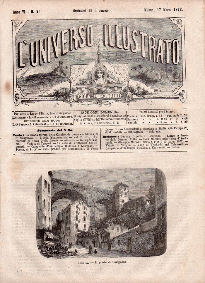 In-4°, pp. 16 (da p. 397 a p. 412). Fascicolo completo proveniente da rilegatura, illustrato da incisioni in bianco e nero. Normali segni d'uso e del tempo (vedi foto), per il resto, ben conservato. Sommario: La strada ferrata della Cornice. I. Da Genova a Savona, di G. Strafforello, con due incisioni raffiguranti "Genova. Il ponte di Carignano" e "Lungo la ferrovia della Cornice. Voltri"; L'isola monumentale, con un'incisione raffigurante "Isola Monumentale (Isole d'Auckland)"; Val d'Olivi, racconto di Anton Giulio Barrili (IV, continua); Attualità: Mondo scientifico (si comunica l'uscita del volume Sulla resistenza dei materiali da costruzioni, dell'ing. Lazzaro Fobini e dell'annuncio fatto dal prof. Igino Cocchi in un'adunanza della Società antropologica ed etnologica di Firenze della scoperta di due scimmie fossili in Toscana, una a Montebamboli, l'altra a Montevarchi) - Invenzioni (si informa circa il piano quatuor, del Baudet, pianoforte che riproduceva anche il suono del violino, della viola e del violoncello, il metodo di fissare lo zucchero della barbabietola con la calce, ottenendo un sucrato di calce inalterabile, l'oroliografo, strumento, ideato dal prof. Rizieri Calcinardi di Desenzano, per delineare orologi solari) - Concorsi e premi (si dà pubblicità alle notizie dei concorsi aperti dalla Società pedagogica italiane e dalla Società promotrice de' Giardini d'infanzia) - Mondo teatrale (si dà brevemente conto della riuscita di una rappresentazione delle opere L'onore del marito, di Carlo Lorenzini, Nemici del matrimonio, di Ludovico Muratori, Carlotta Corday, di S. Interdonato); Giuseppe Mazzini, con un ritratto, inciso, a piena pagina recante la didascalia "Giuseppe Mazzini (morto a Pisa il 10 marzo 1872)"; Veduta di Tangeri, con un'incisione a piena pagina raffigurante la veduta; La valle di Vestfjordal nel Telemark, con un'incisione a piena pagina raffigurante la valle; Campanile d'un tempio buddista a Kawasaki, con un'incisione a piena pagina raffigurante la costruzione; La casa paterna. A mio fratello, poesia di L. M., giovinetta padovana; Paesi perduti pel germanismo, di Fedele Lampertico; Studi storici: Sollevazioni e congiure in Sicilia sotto Filippo IV, di G. Galatti; Bibliografia; Rebus.